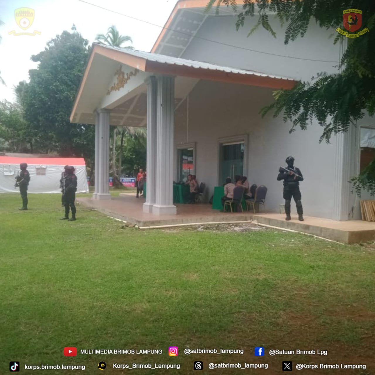 BrimobLampung - Personel Subden Wanteror Detasemen Gegana Satbrimobda Lampung yang tergabung dalam Subsatgas Anti Khusus OMBK 2024 dipimpin langsung oleh Panit 1 Wanteror Detasemen Gegana Aipda Pahala Simamora amankan rapat pleno Rekapitulasi Hasil perhitungan suara Pemilu 2024 Kabupaten Lampung Selatan di Gedung Aula Gedung Negeri Baru Resort Kalianda Lampung Selatan, Senin(4/03/24).