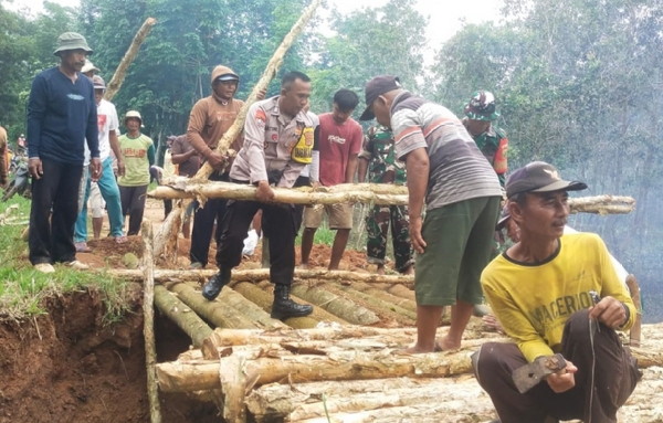 Bhabinkamtibmas Polsek Sekampung Bergotong Royong Bersam Warga Bangun Jembatan