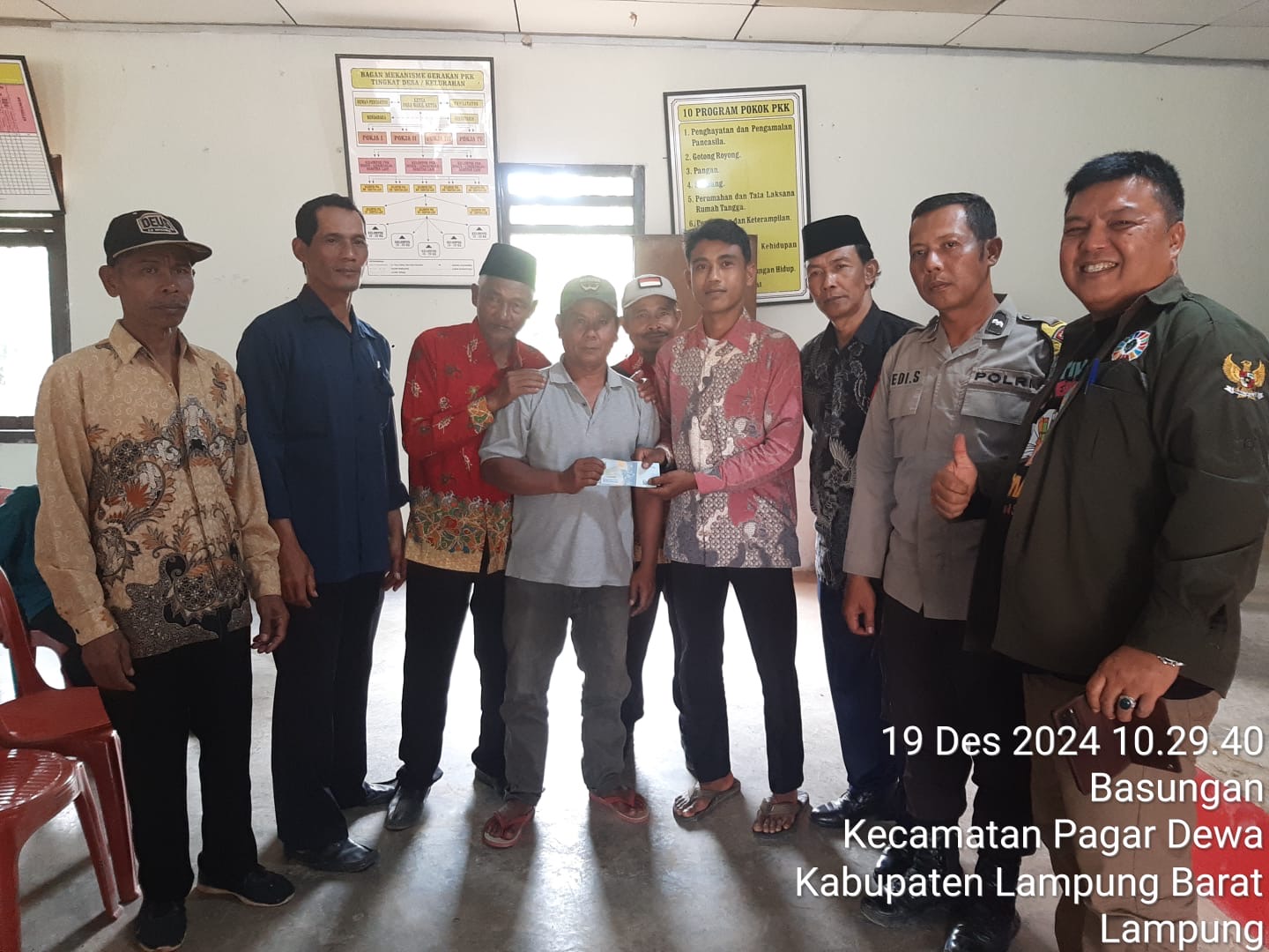 Lampung Barat, Sabtu 21 Desember 2024-Bhabinkamtibmas Polsek Sekincau, Aipda Dedi Siswanto, turut hadir dalam kegiatan pembagian Bantuan Langsung Tunai (BLT) Dana Desa (DD) di Balai Pekon Basungan, Kecamatan Sekincau, Lampung Barat. Acara tersebut bertujuan untuk menyalurkan bantuan kepada warga yang berhak, guna membantu meringankan beban ekonomi mereka.