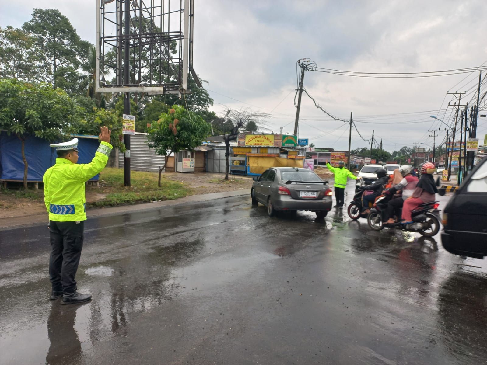 tribratanews.lampung.polri.go.id Pesawaran Sabtu 20 September 2025 Polres Pesawaran, Polda Lampung – Wujud pengabdian tanpa kenal lelah kembali ditunjukkan personel Satuan Lalu Lintas (Sat Lantas) Polres Pesawaran. Pada Sabtu pagi (20/9/2025) pukul 06.30 WIB, meskipun wilayah Gedong Tataan diguyur hujan, jajaran Sat Lantas tetap melaksanakan pengaturan arus lalu lintas di Simpang Tugu Coklat, Jalan Lintas Barat (Jalinbar), Pesawaran.