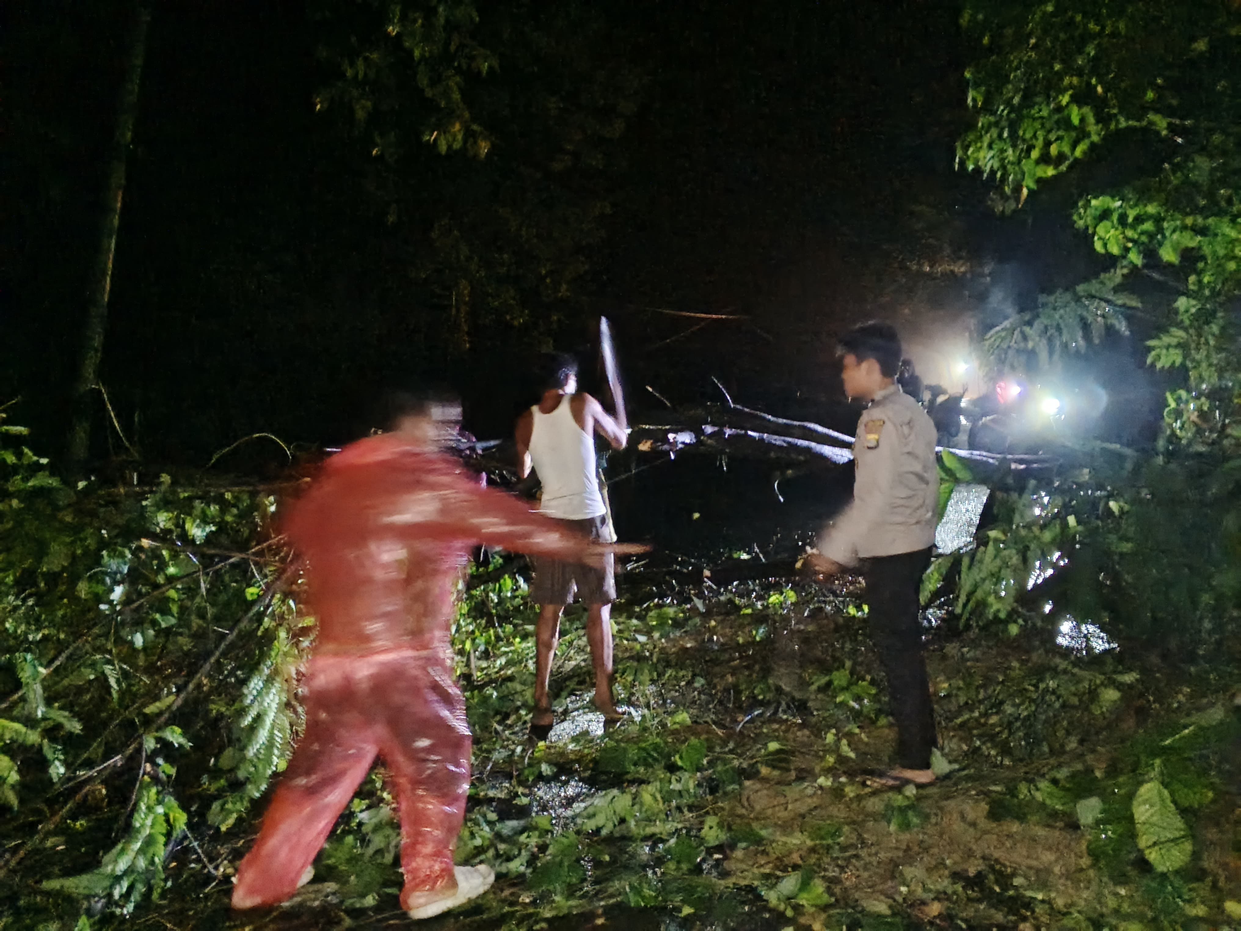 tribratanews.lampung.polri.go.id. Pesisir Barat Senin 29 September 2025 — Aksi sigap ditunjukkan oleh jajaran Polsek Pesisir Utara saat sebuah pohon besar tumbang dan menutup akses jalan utama di wilayah tersebut pada Minggu Malam,28/9/2025.Peristiwa ini terjadi sekitar pukul 19.30 WIB, diduga akibat hujan lebat disertai angin kencang yang melanda sejak beberapa hari terakhir ini. Begitu menerima laporan dari warga, petugas Polsek Pesisir Utara langsung turun ke lokasi dan melakukan evakuasi bersama masyarakat sekitar. Proses pembersihan memakan waktu sekitar satu jam hingga arus lalu lintas kembali normal. Kapolres Pesisir Barat AKBP Bestiana, S.I.K., M.M. melalui Kapolsek Pesisir Utara, IPTU Imam Sanuwan, mengatakan bahwa langkah cepat ini dilakukan untuk menghindari kemacetan parah dan potensi kecelakaan lalu lintas. “Kami prioritaskan keselamatan pengguna jalan. Alhamdulillah, tidak ada korban jiwa dalam kejadian ini,” ujarnya.