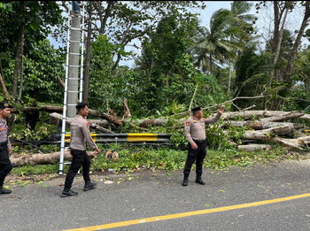 Tribratanews.lampung.polri.go.id Pesisir Barat, Kamis 06 Nopember 2025- Sat Samapta Polres Pesisir Barat bergerak cepat mengevakuasi pohon tumbang yang menutupi jalan lintas tanjung setia Pesisir Selatan, pada Kamis,6/11/2025.Pohon berukuran besar itu tumbang akibat hujan deras disertai angin kencang yang melanda sejak dini hari.Kejadian tersebut sempat menyebabkan arus lalu lintas di jalan lintas utama menuju pusat kota Krui dan sebaliknya tersendat.