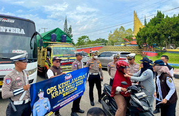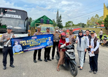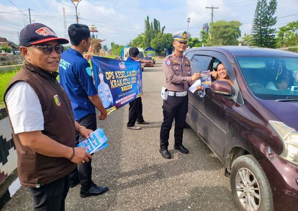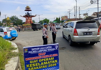 tribratanews.lampung.polri.go.id. Lampung Tengah, Kamis 05 Pebruari 2026 – Hari ketiga pelaksanaan Operasi Keselamatan Krakatau 2026, Satlantas Polres Lampung Tengah, Polda Lampung bersama Bappeda, Jasa Raharja, dan Dinas Perhubungan (Dishub) Kabupaten Lampung Tengah melaksanakan kegiatan edukasi humanis kepada masyarakat pengguna jalan, Rabu pagi (4/2/26).Kegiatan tersebut dilaksanakan di simpang Tugu Pepadun, Gunung Sugih, Kabupaten Lampung Tengah, dengan membagikan ratusan pamflet dan stiker keselamatan berlalu lintas, serta puluhan helm gratis kepada pengendara sebagai bentuk kepedulian terhadap keselamatan di jalan raya.