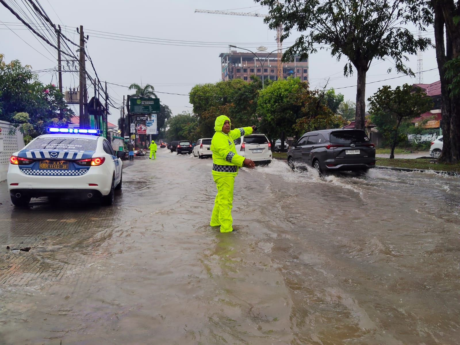 Hujan Deras Picu Genangan Air, Polisi Sigap Atur Arus Lalu Lintas di Bandar Lampung