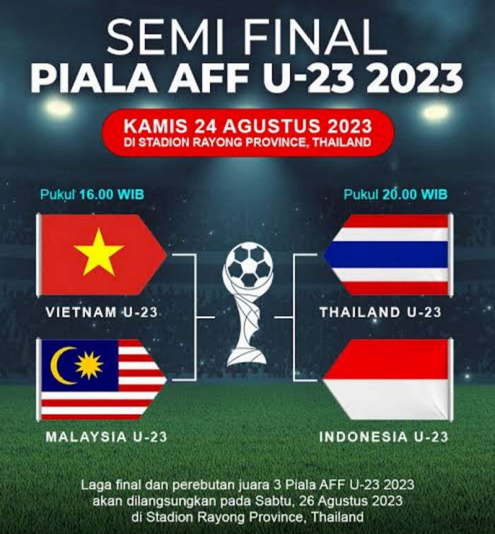 https://tribratanews.lampung.polri.go.id. Jakarta. Jadwal semifinal Thailand melawan Indonesia di Piala AFF U-23 dalam laga babak empat besar yang digelar di Rayong, pada Kamis (24/8/23).