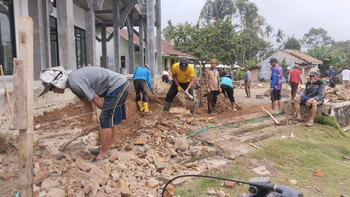 Ps. Kanit Binmas Aipda Eko Wahyudi bersama Kepala Kampung Talang Mangga Igap Sujiman dan warga untuk melaksanakan giat gotong royong pembuatan teras Masjid dan perapihan untuk dipergunakan dalam beribadah pengajian dan menyambut datangnya Bulan Suci Ramadhan 1447 H.