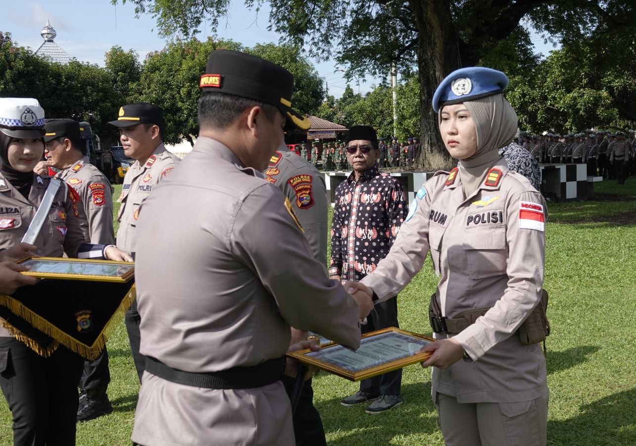tribratanews.lampung.polri.go.id. Lampung Tengah - Kapolres Lampung Tengah, Polda Lampung, AKBP Andik Purnomo Sigit, S.H., S.I.K., M.M memberikan penghargaan kepada personelnya dan sejumlah pihak yang telah menunjukkan prestasi, dedikasi, dan loyalitas luar biasa dalam mendukung pelaksanaan Pilkada serta tugas-tugas Kepolisian di wilayah Lampung Tengah.Penghargaan tersebut diberikan Kapolres saat memimpin apel gelar pasukan Operasi Lilin Krakatau 2024 di halaman apel Mapolres setempat, yang dihadiri oleh Forkopimda, para PJU, Kapolsek, FKUB, Ormas dan tamu undangan lainnya. Jumat (20/12/24) pagi Dalam sambutannya, Kapolres mengatakan bahwa penghargaan ini diberikan sebagai bentuk apresiasi terhadap prestasi para personel dan seluruh pihak yang terlibat dalam menjaga keamanan dan kelancaran Pilkada di Kabupaten Lampung Tengah. “Terima kasih atas prestasi, dedikasi dan kerja sama yang telah ditunjukkan. Semua yang kita raih hari ini berkat komitmen dan semangat kebersamaan dalam menjaga keamanan, kedamaian dan kondusifitas daerah kita,” kata Kapolres. Adapun sejumlah personel Polres Lampung Tengah yang mendapat penghargaan antara lain: 1. Polsek Padang Ratu: Mendapatkan penghargaan atas prestasi dalam bidang pembinaan dan operasional, serta sebagai Polsek dengan ungkap kasus terbanyak selama tahun 2024 di wilayah hukum Polres Lampung Tengah. 2. Polsek Rumbia: Nominasi Polsek dengan inovasi terbaik di Polda Lampung dalam ajang Kompolnas Award. 3. Iptu Bayu Zefriyandi Ogara, S.Psi., M.M.: Panit 1 Unit Lantas Polsek Terbanggi Besar yang meraih Juara III kelas -81 kg Putera kategori TNI-Polri pada Kejuaraan Nasional Judo Kasad Cup ke-XV 2024. 4. Iptu Arum Monita Sari, S.Tr.K.: Kasubsipenmas Sihumas, yang menunjukkan prestasi luar biasa sebagai anggota Satgas Garbha FPU 5 MINUSCA di Republik Afrika Tengah. 5. Aipda Adi Sukarmin: Ps. Panit 2 Unit Lantas Polsek Terbanggi Besar, yang mencetuskan logo tunggul Duaja Polres Lampung Tengah. 6. Aiptu Daswin Saleh, S.A.P.: Ps. Kanit 1 Sat Intelkam, yang menunjukkan dedikasi dalam bidang operasional. 7. Ipda Anton Rasdianto, S.Pd.I.: Kanit Turjawali Sat Lantas, yang berhasil mengungkap tindak pidana narkotika dalam razia di wilayah hukum Polres Lampung Tengah. 8. Aiptu Eddy Mardiyanto, S.IP.: Banit Laka Sat Lantas, yang juga turut mengungkap tindak pidana narkotika dalam razia. 9. Bripka M. Hakim Pangkuan Nyerupa, S.H.: Banit Regident Sat Lantas, yang memberikan kontribusi besar dalam operasi razia narkotika. 10. Bripka I Wayan Rendra Wijaya, S.H.: Ps. Paur Subbagbinops Bag Ops, atas dedikasinya dalam tugas operasional. Selain itu, Irawan Indra Jaya, SKM (Eks Ketua KPU Kabupaten Lampung Tengah), Yuli Efendi, S.Pd.I., S.H. (Ketua Bawaslu Kabupaten Lampung Tengah), serta Miswan Rody, S.I.P. (Ketua Tim Sukses Paslon No Urut 01) dan Sumarsono (Ketua Tim Sukses Paslon No Urut 02), turut menerima penghargaan atas kontribusi mereka dalam menyelenggarakan Pilkada yang aman, damai, dan kondusif. Terakhir, penghargaan juga diberikan kepada Persatuan Wartawan Indonesia (PWI) Kabupaten Lampung Tengah, yang telah berperan aktif dalam mendukung publikasi dan penyajian berita untuk menciptakan suasana yang aman dan damai selama Pilkada. Kapolres berharap penghargaan ini dapat menjadi motivasi bagi seluruh jajaran untuk terus meningkatkan kinerja dan bekerja sama dalam menciptakan keamanan dan ketertiban di Kabupaten Lampung Tengah. “Mari terus bekerja dengan penuh semangat, profesionalisme, dan kita perkuat sinergitas untuk mewujudkan Kabupaten Lampung Tengah yang maju, aman dan kondusif,” tutup Kapolres.