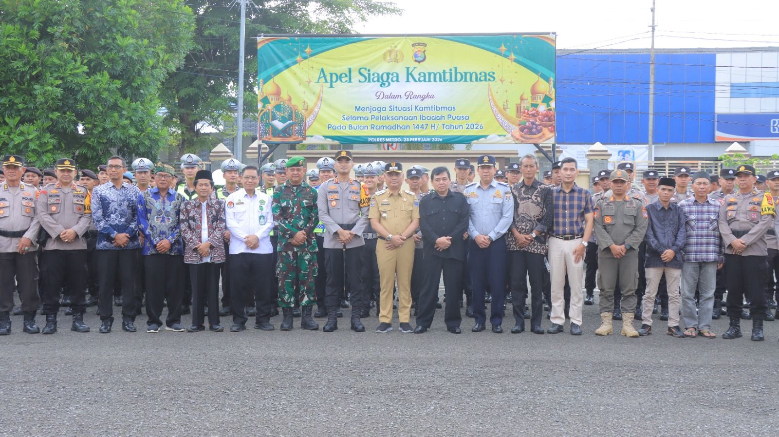tribratanews.lampung.polri.go.id Metro Lampung, Selasa 24 Pebruari 2026 – Dalam rangka menjaga situasi keamanan dan ketertiban masyarakat (kamtibmas) selama pelaksanaan ibadah puasa Ramadhan 1447 Hijriah/2026 Masehi, Kapolres Metro AKBP Hangga Utama Darmawan, S.I.K., memimpin langsung Apel Siaga Kamtibmas yang digelar di halaman Mapolres Metro, Senin (23/02/26) sore.Apel siaga tersebut turut dihadiri oleh Wali Kota Metro serta jajaran Forum Koordinasi Pimpinan Daerah (Forkopimda) Kota Metro. Kehadiran unsur pimpinan daerah ini menjadi wujud nyata sinergitas dan soliditas lintas sektor dalam menjaga kondusivitas wilayah selama bulan suci Ramadhan. Selain diikuti pejabat utama Polres Metro dan para Kapolsek jajaran, kegiatan ini juga melibatkan personel gabungan serta perwakilan instansi terkait. Apel siaga ini merupakan bentuk kesiapan Polres Metro bersama seluruh pemangku kepentingan dalam memberikan rasa aman dan nyaman kepada masyarakat. Dalam arahannya, Kapolres Metro AKBP Hangga Utama Darmawan, S.I.K. menegaskan pentingnya meningkatkan kewaspadaan serta kehadiran personel di tengah masyarakat, terutama pada waktu-waktu rawan seperti menjelang sahur, usai salat tarawih, dan saat aktivitas ngabuburit. “Kegiatan apel siaga ini merupakan komitmen kita bersama untuk memastikan situasi kamtibmas di wilayah hukum Polres Metro tetap aman, tertib, dan kondusif selama bulan suci Ramadhan 1447 H. Saya instruksikan seluruh personel untuk meningkatkan patroli, deteksi dini, serta respons cepat terhadap setiap potensi gangguan keamanan,” tegas Kapolres. Kapolres juga menekankan pentingnya pendekatan humanis dalam pelaksanaan tugas, dengan mengedepankan upaya preventif dan preemtif guna mencegah terjadinya gangguan kamtibmas, seperti balap liar, penggunaan petasan berlebihan, perang sarung, hingga potensi tindak kriminalitas. Sinergitas antara Polres Metro, TNI, Pemerintah Kota, dan seluruh unsur Forkopimda diharapkan semakin memperkuat koordinasi serta efektivitas pengamanan di lapangan. Kolaborasi ini dinilai menjadi kunci utama dalam menciptakan suasana Ramadhan yang damai dan penuh kekhusyukan. “Kami tidak bisa bekerja sendiri. Dibutuhkan dukungan seluruh elemen masyarakat untuk bersama-sama menjaga keamanan lingkungan masing-masing. Mari kita jadikan Ramadhan tahun ini sebagai momentum memperkuat kebersamaan dan kepedulian sosial, sehingga terwujudnya Ramadhan Aman, Ibadah Nyaman, Kamtibmas Kondusif” tambah Kapolres. Polres Metro juga akan mengintensifkan patroli rutin, pengamanan pusat perbelanjaan, pasar takjil, masjid, serta lokasi-lokasi yang menjadi pusat aktivitas masyarakat selama Ramadhan. Langkah ini diharapkan mampu memberikan jaminan rasa aman sehingga masyarakat dapat menjalankan ibadah dengan tenang dan khusyuk. Dengan digelarnya Apel Siaga Kamtibmas ini, Polres Metro bersama Forkopimda Kota Metro menegaskan komitmennya untuk terus hadir sebagai pelindung, pengayom, dan pelayan masyarakat demi terwujudnya situasi kamtibmas yang aman dan kondusif sepanjang bulan suci Ramadhan 1447 H/2026.