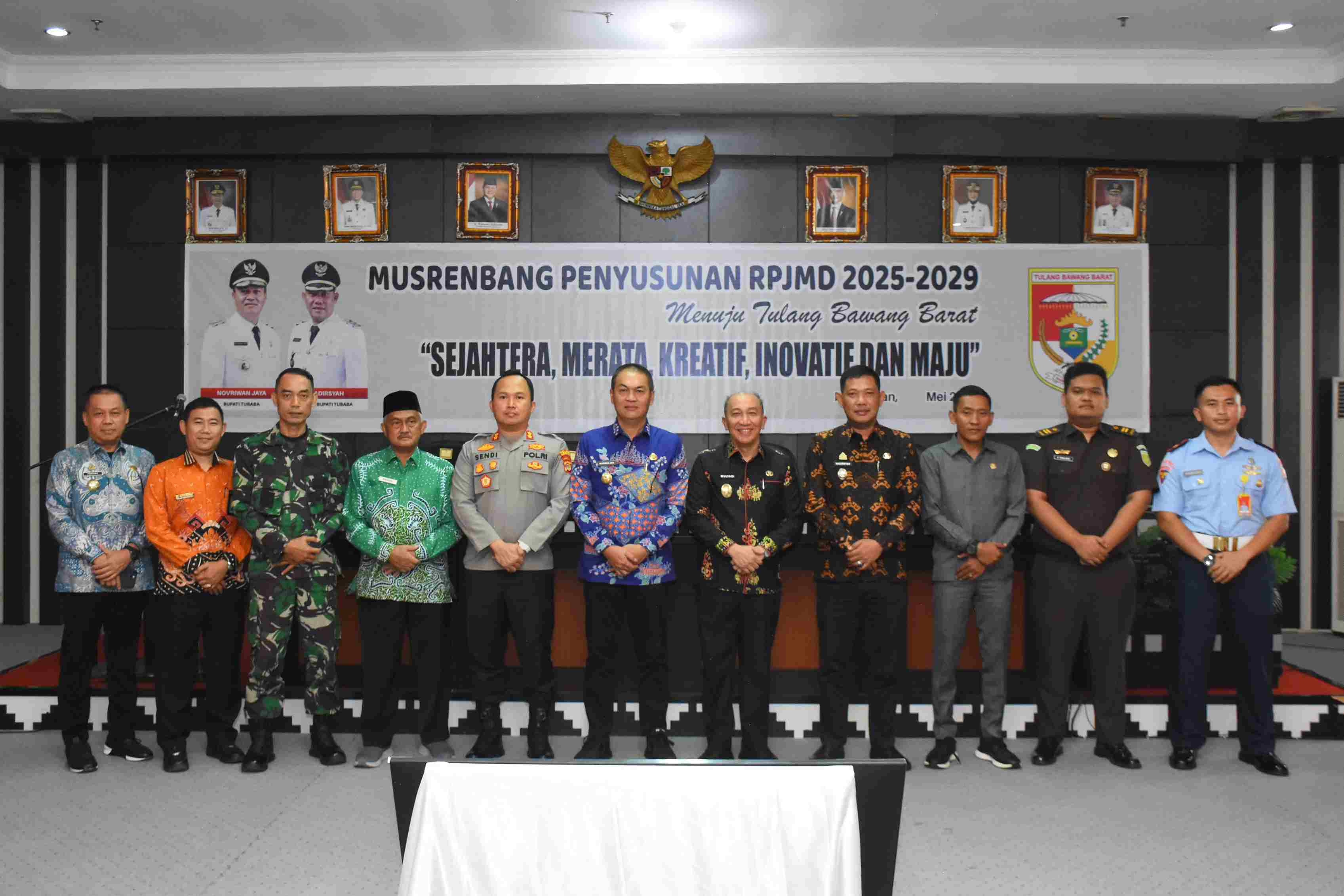 Tribratanews Lampung polri go id. Tulang Bawang Barat-Kepala Kepolisian Resor Tulang Bawang Barat, AKBP Sendi Antoni S.I K., M.I.K, menghadiri kegiatan Pembukaan Musyawarah Perencanaan Pembangunan (Musrenbang) Rencana Pembangunan Jangka Menengah Daerah (RPJMD) Kabupaten Tubaba Tahun 2025–2029, yang digelar pada di Ruang Rapat Bupati Pemkab Tubaba, Kamis (22/05/2025)Kegiatan strategis ini dihadiri langsung oleh Bupati Tubaba Ir. Novriwan Jaya, S.P., Ketua DPRD Busroni, S.H Sekda Kab.Tubaba jajaran Forkopimda, kepala OPD, camat se-Kabupaten Tubaba serta tokoh masyarakat, akademisi, dan tamu undangan lainnya. Kapolres Tubaba menyampaikan bahwa kehadiran Polri dalam kegiatan ini merupakan bentuk dukungan terhadap proses perencanaan pembangunan daerah yang inklusif dan partisipatif, serta sebagai wujud sinergi lintas sektor dalam mewujudkan kemajuan daerah. “Kami mendukung penuh setiap tahapan perencanaan yang dilakukan oleh Pemerintah Daerah. Musrenbang RPJMD ini menjadi langkah awal penting dalam merumuskan arah pembangunan lima tahun ke depan, yang tentunya harus berlandaskan pada kebutuhan riil masyarakat serta prinsip transparansi dan akuntabilitas,” ujar Kapolres. Dalam sambutannya, Bupati Tubaba menekankan bahwa RPJMD 2025–2029 disusun selaras dengan visi dan misi kepala daerah terpilih serta selaras dengan RPJMN 2025–2029. Visi yang diusung dalam dokumen RPJMD ini adalah Menuju Tubaba "Sejahtera, Merata, Kreatif, inovatif dan Maju