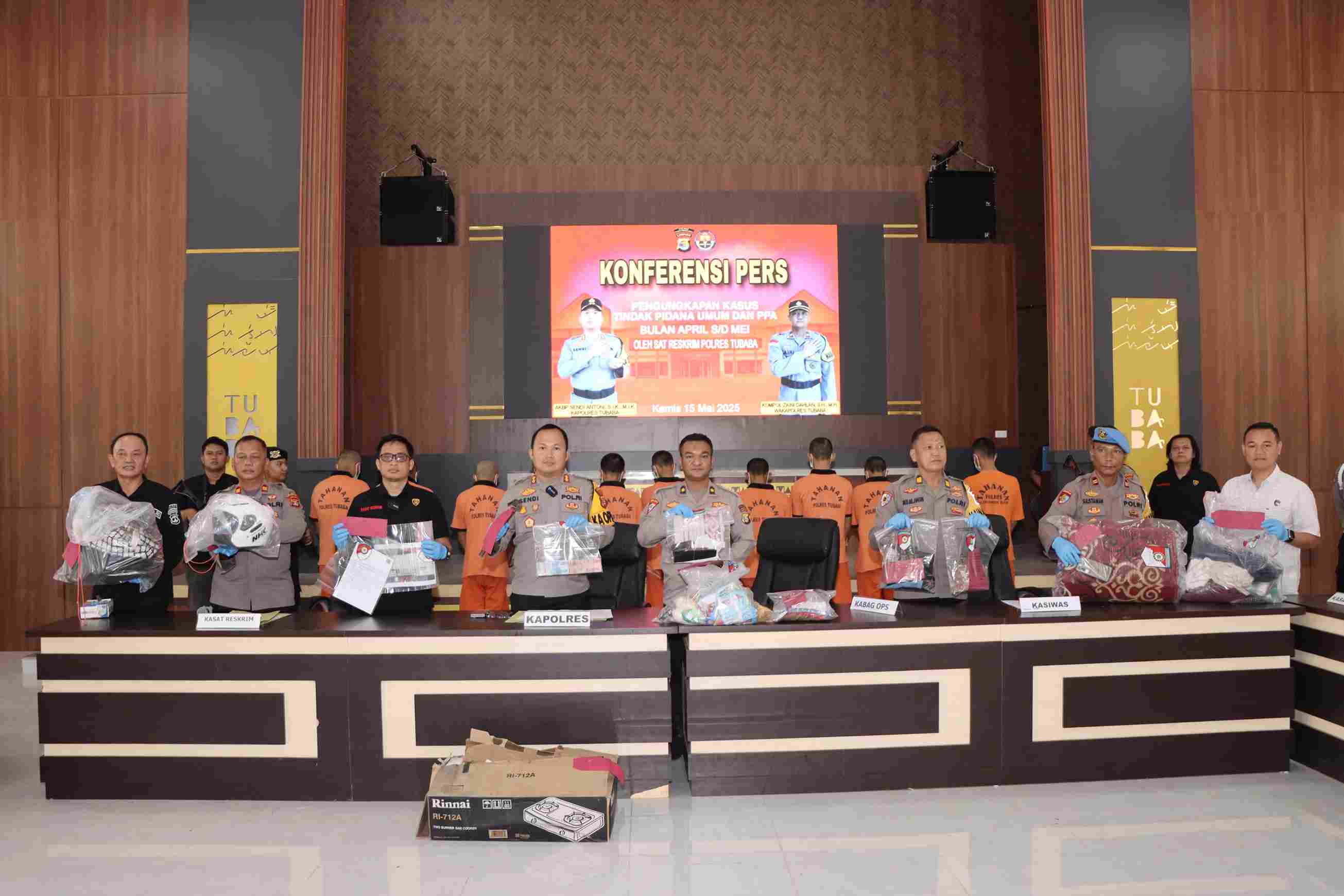 Bulan April s/d Mei Tahun 2025, Polres Tubaba berhasil mengungkap sejumlah kasus menonjol antara lain kasus Curat sebanyak 7 (tujuh) kasus dengan Tersangka 7 (tujuh) Orang, Kasus Tipu Gelap 1 (satu) Kasus dengan Tersangka 1 (satu) Orang, Kasus Kdrt 1 (satu) Kasus dengan Tersangka 1 (satu) Orang, Persetubuhan di bawah umur 2 (dua) Kasus dengan Tersangka 3 (tiga) Orang dan Perbuatan tidak menyenangkan disertai Ancaman kekerasan 1 (satu) Kasus dengan Tersangka 1 (satu) Orang, Para tersangka yang terlibat dalam tindak pidana tersebut telah berhasil diamankan dan tengah menjalani proses hukum lebih lanjut. Dalam kesempatan ini Kapolres juga menyampaikan barang bukti yang berhasil di amankan berupa 5 (lima) Unit Sepeda Motor, Uang Kurang Lebih RP 13.845.000, 2 (dua) buah Handphone,1 (satu) buah senjata tajam Golok, 1 (satu) Buah Palu Besi warna Coklat,1 (satu) Buah Kompor Gas merk Rinnai warna Silver, beserta lainnya sesuai pengungkapan kasus Tindak Pidana Umum dan PPA. Keberhasilan ini merupakan hasil kerja keras seluruh personel kami, serta dukungan dan kepercayaan dari masyarakat. Kami akan terus hadir dan bertindak tegas terhadap setiap bentuk pelanggaran hukum,” tegas AKBP Sendi Antoni kepada awak media. Dalam kesempatan tersebut, Kapolres juga mengajak masyarakat untuk terus bersinergi dengan Polri dalam menjaga situasi kamtibmas yang aman dan kondusif. Ia menekankan pentingnya partisipasi aktif warga untuk melaporkan setiap potensi gangguan keamanan di lingkungan sekitar. Konferensi Pers ini menggambarkan keberhasilan Polres Tulang Bawang Barat dalam menjaga keamanan dan ketertiban masyarakat, serta komitmen untuk terus meningkatkan kinerja dalam melindungi mengayomi dan melayani Masyarakat” Pungkas Kapolres.