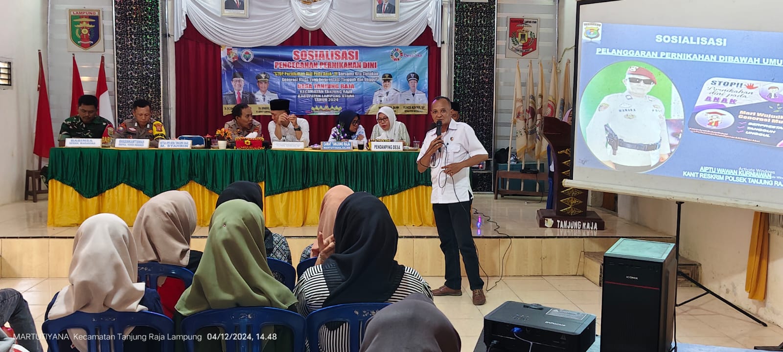 tribratanews.lampung.polri.go.id Lampung Utara Kamis 05 Desember 2024- Kapolsek Tanjung Raja Polres Lampung Utara Iptu Syamsul Rizal sosialisasi pencegahan pernikahan dini anak dibawah umur yang berlangsung di Balai Desa Tanjung Raja Kecamatan Tanjung Raja Kabupaten setempat, Rabu (4/12/24).Kegiatan tersebut turut di hadiri Camat Tanjung Raja Martutiyana, Kepala KUA Tanjung Raja H. Abdul Rohim, Kepala Desa Tanjung Raja Yunis, Kanit Reskrim Aiptu Wawan, Bhabinkamtibmas, Bhabinsa dan muda mudi Desa Tanjung Raja. Kapolres Lampung Utara AKBP Deddy Kurniawan melalui Kapolsek Tanjung Raja Iptu Syamsul Rizal mengatakan, kegiatan sosialisasi pencegahan pernikahan anak dibawah umur tersebut dilaksanakan untuk memberikan edukasi pengetahuan kepada generasi muda terutama yang masih dibawah umur tentang dampak serta peraturan perundang-undangan yang mengatur tentang pernikahan yang masih dibawah umur, sehingga kedepan hal tersebut dapat diminimalisir. "Melalui kegiatan ini, kami menyampaikan bahwa pentingnya memahami aturan-aturan, dampak hukum, serta upaya yang dilakukan terkait pernikahan din anak dibawah umur," kata Kapolsek. Lanjut Kapolsek, beberapa aturan tentang Undang-Undang Perlindungan Anak, dan Undang-Undang Pernikahan, serta dampak hukum dari pernikahan dini, serta upaya-upaya yang harus dilakukan. Demi kondusifitas kamtibmas, Kapolsek juga mengajak untuk bersama-sama menjaga keamanan lingkungan sekitar, dengan tidak melakukan tindakan yang melanggar hukum. "Kami juga mengajak para undangan untuk selalu menjaga situasi keamanan lingkungan sekitar tempat tinggal, dan bilamana terjadi gangguan keamanan dapat menghubungi aparat keamanan setempat," ujar Kapolsek.