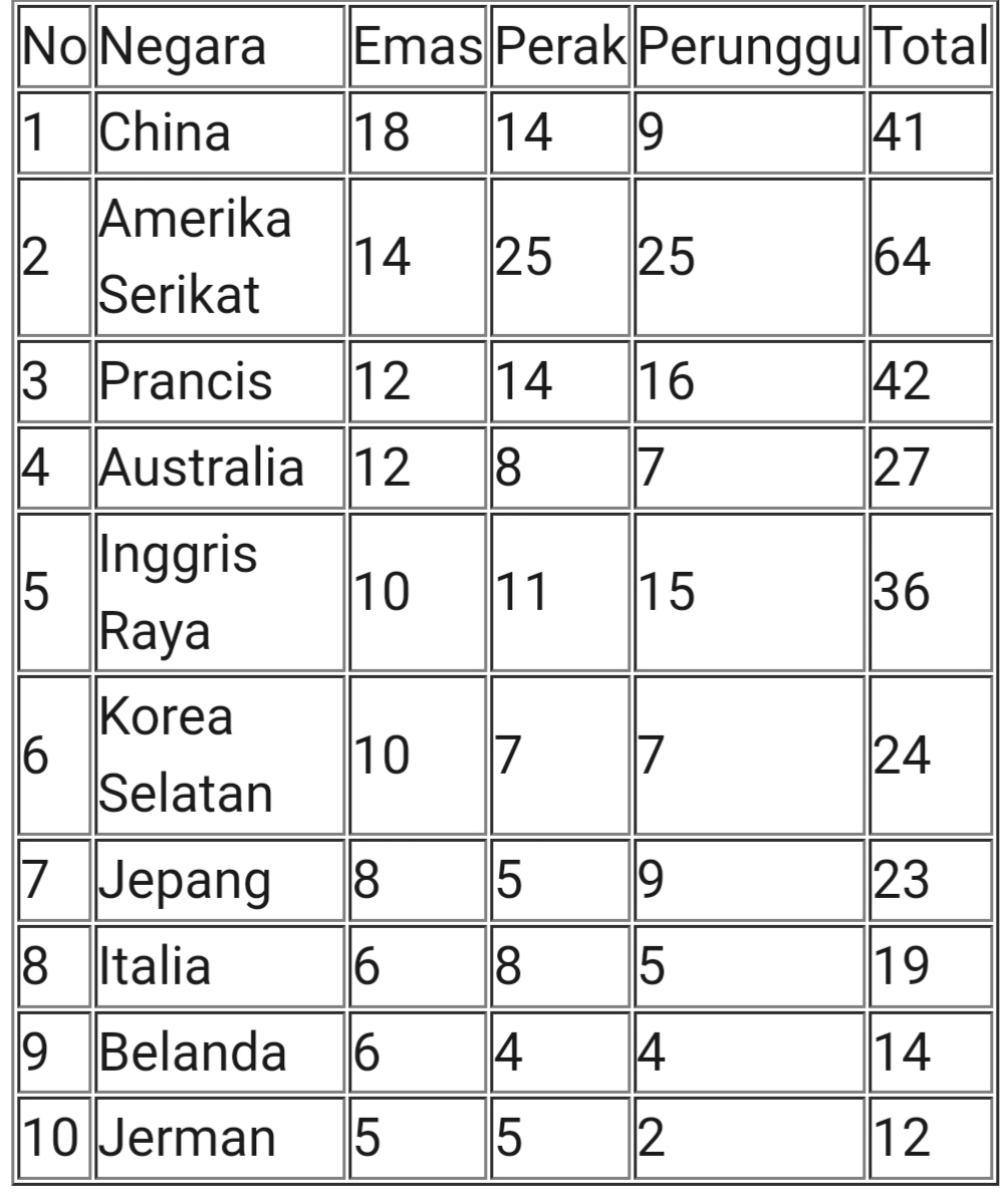 tribratanews.lampung.polri.go.id. Jakarta (ANTARA) - Indonesia akhirnya meraih medali pertama di Olimpiade 2024 melalui cabang bulutangkis dan kini berada di urutan 61 dengan sembilan negara lain.Berdasarkan situs resmi Olimpiade 2024 Paris pada Sabtu (04/8) per pukul 22.00 WIB, China masih berada di urutan teratas dengan torehan 18 emas, 14 perak, dan 9 perunggu. Negeri Tirai Bambu tersebut total telah meraih 41 medali dengan tambahan emas dari Fan Zhendong (tenis meja) dan Liu Yang (senam artistik).