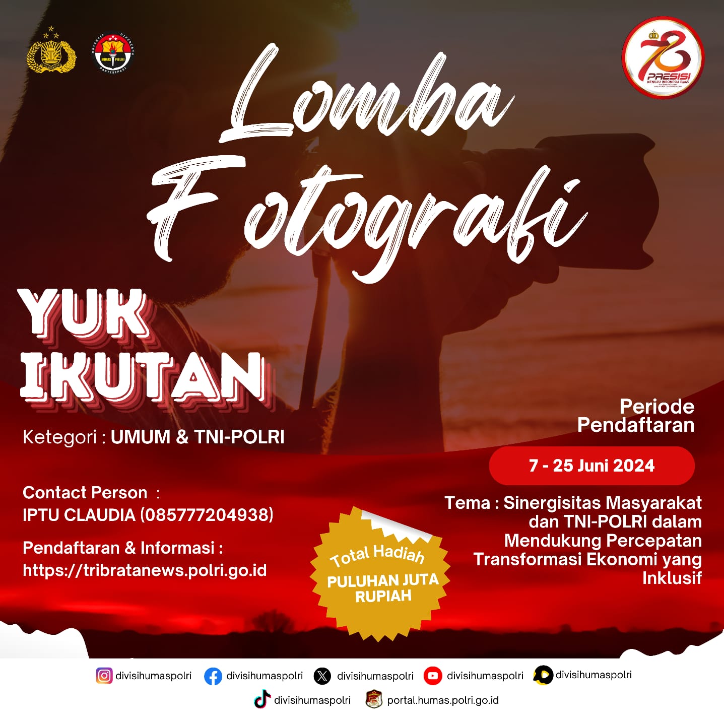 Menjelang Hari Bhayangkara ke-78, Divisi Humas Polri mengadakan beberapa perlombaan seru nih Sobat Polri! Ayo ikuti dan daftarkan karyamu pada Lomba Fotografi Segera daftarkan diri kalian di website: tribratanews.polri.go.id dan jadilah pemenang!!