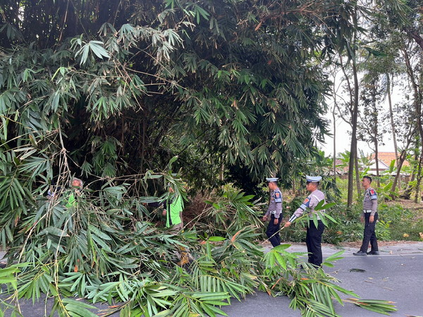 Membahayakan Pengguna Jalan, Satlantas Polres Lamtim Pangkas Dahan Pohon