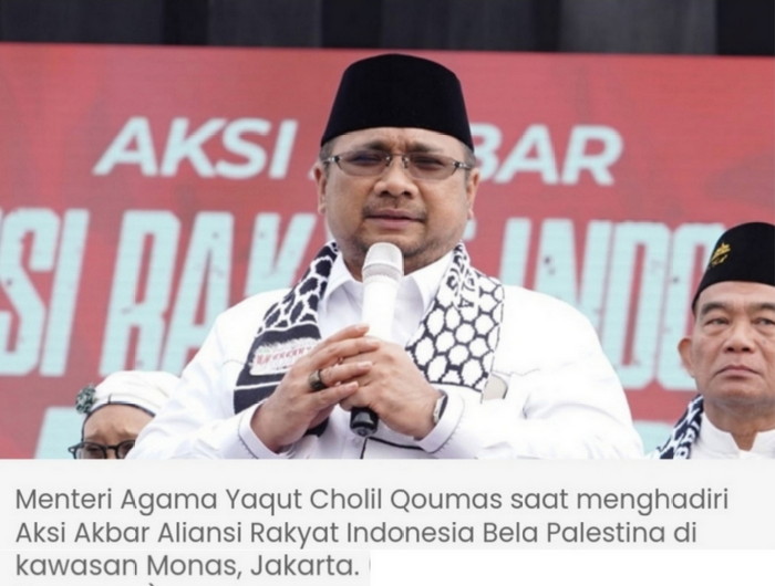 Pernyataan tersebut disampaikan Menag Yaqut saat menghadiri Aksi Akbar Aliansi Rakyat Indonesia Bela Palestina di kawasan Monas, Jakarta, Minggu (5/11/2023).