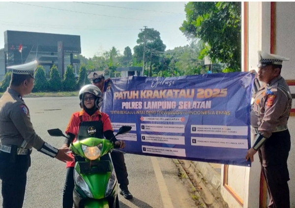 tribratanews.lampung.polri.go.id, Lampung Selatan, Jumat 25 Juli 2025, - Polres Lampung Selatan terus menggencarkan kegiatan edukatif dalam rangka Operasi Patuh Krakatau 2025. Pada Jumat (25/7/2025), Satlantas Polres Lamsel menggelar penyuluhan dan imbauan tertib berlalu lintas kepada para pengendara di Jalan Lintas Sumatera, tepatnya di Simpang Masjid Agung Kalianda. Kegiatan dimulai sejak pukul 09.00 WIB hingga selesai.