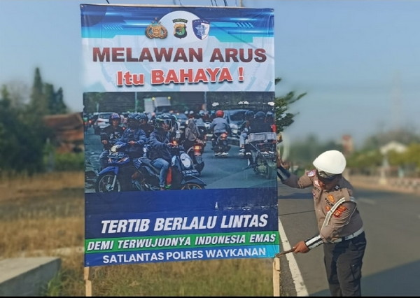tribratanews.lampung.polri.go.id. Satlantas Polres Way kanan melaksanakan kegiatan pemasangan banner himbauan etika berlalu lintas dalam rangka Operasi Patuh Krakatau 2025 di sepanjang Jalan Km 10 Kecamatan Umpu Semenguk sampai dengan Km 01 Kecamatan Blambangan Umpu Kabupaten Way Kanan. Jum’at (25/07/2025).Kapolres Way Kanan AKBP Adanan Mangopang melalui Kasat Lantas Polres Way Kanan AKP Asep Suhendi menyampaikan pemasangan banner himbauan ini bertujuan untuk meningkatkan kesadaran dan kepatuhan masyarakat dalam berlalu lintas.