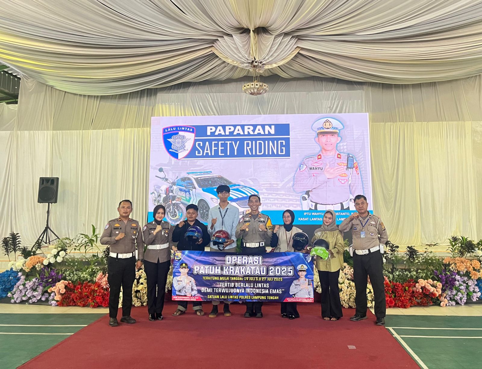 tribratanews.lampung.polri.go.id. Lampung Tengah, Minggu 27 Juli 2025 – Satlantas Polres Lampung Tengah, Polda Lampung menggelar kegiatan sosialisasi bertajuk “Polantas Menyapa” sebagai bagian dari Operasi Patuh Krakatau 2025.Kegiatan ini dilaksanakan pada Sabtu pagi (26/7/25) sekira pukul 10.00 WIB di Gedung Serbaguna Gelompong, Kelurahan Bandar Jaya Barat, Kecamatan Terbanggi Besar, Kabupaten Lampung Tengah.