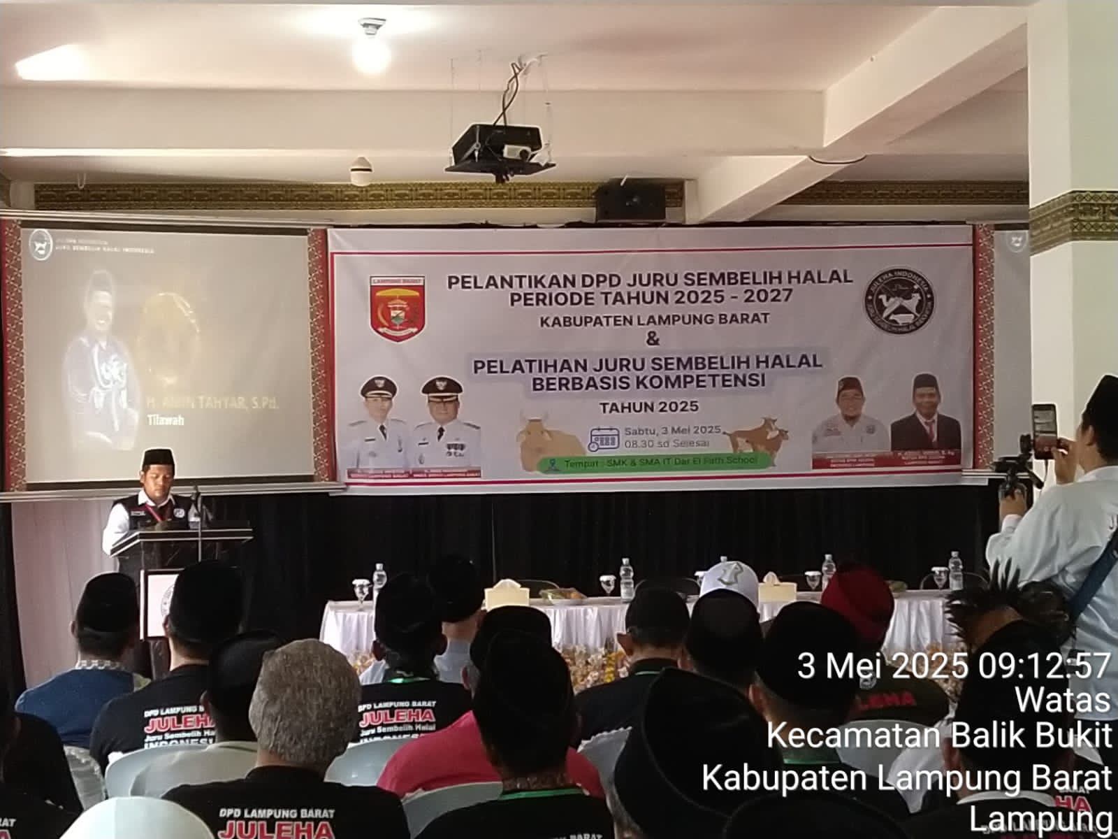 Tribratanews Lampung polri go id. Lampung Barat, Senin 05 Mei 2025 — Dalam rangka meningkatkan kapasitas dan legalitas para juru sembelih halal di wilayah Kabupaten Lampung Barat, kegiatan Pelantikan Pengurus Juru Sembelih Halal (JULEHA) periode 2025 hingga 2027 sukses digelar pada Minggu, 04 Mei 2025. Acara berlangsung mulai pukul 09.00 WIB bertempat di Aula SMK IT Dar El Fath School, Pekon Watas, Kecamatan Balik Bukit.Kapolres Lampung Barat AKBP Rinaldo Aser, SH, SIK, MSI, melalui Kapolsek Balik Bukit IPTU Sabtudin, menyampaikan bahwa kegiatan ini tidak hanya berfokus pada pelantikan kepengurusan baru, tetapi juga memberikan edukasi teknis mengenai tata cara penyembelihan hewan ternak sesuai syariat Islam, yang disampaikan oleh pemateri dari JULEHA Provinsi Lampung. Kegiatan ini turut dihadiri oleh sejumlah pejabat penting dan tokoh masyarakat, di antaranya Wakil Bupati Lampung Barat, Ketua JULEHA Provinsi Lampung, perwakilan dari Kementerian Agama Kabupaten Lampung Barat, Asisten Daerah, Kepala Dinas Perkebunan dan Peternakan, Ketua BAZNAS Lampung Barat, serta panitia pelaksana kegiatan. Selain itu, peserta yang hadir dalam kegiatan ini berjumlah sekitar 100 orang, terdiri dari calon juru sembelih halal, panitia, dan perwakilan komunitas masyarakat. Polsek Balik Bukit yang menugaskan personelnya untuk memonitor jalannya acara menyampaikan bahwa kegiatan berlangsung aman, tertib, dan penuh semangat edukatif. Dengan terselenggaranya pelatihan dan pelantikan ini, diharapkan para juru sembelih di Lampung Barat dapat semakin kompeten, profesional, serta menjunjung tinggi prinsip halal dalam setiap praktik penyembelihan.