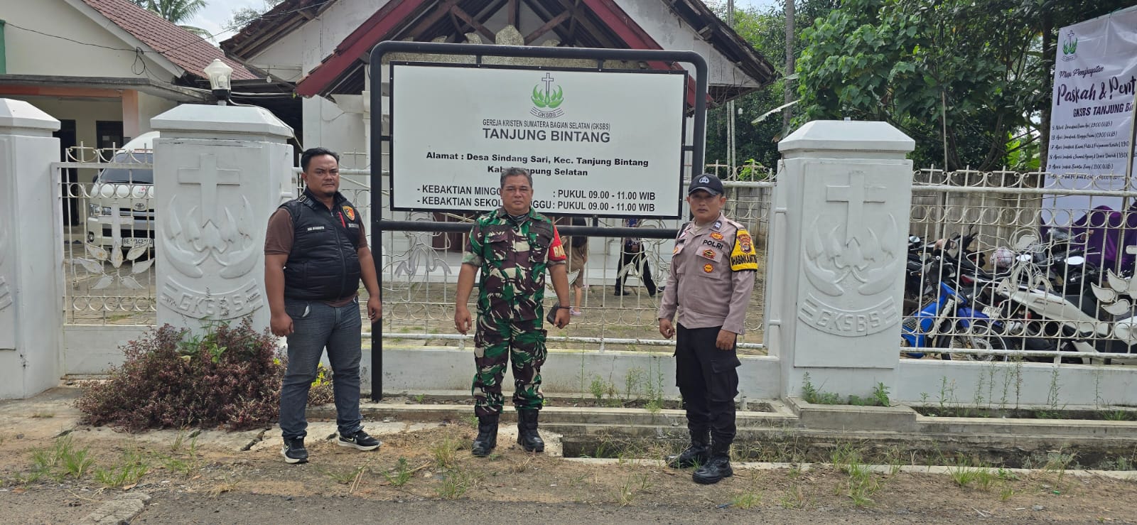 tribratanews.lampung.polri.go.id. Tanjung Bintang, Lampung Selatan, Jumat 18 April 2025 – Pengamanan di Gereja GKSBS Desa Sindangsari, Kecamatan Tanjung Bintang, Kabupaten Lampung Selatan. Pengamanan ini dilakukan dalam rangka ibadah memperingati wafatnya Yesus Kristus (Jumat Agung). Ibadah dimulai Pada Jumat, 18 April 2025 pukul 14:40 WIB dan dihadiri oleh sekitar 60 jemaat.