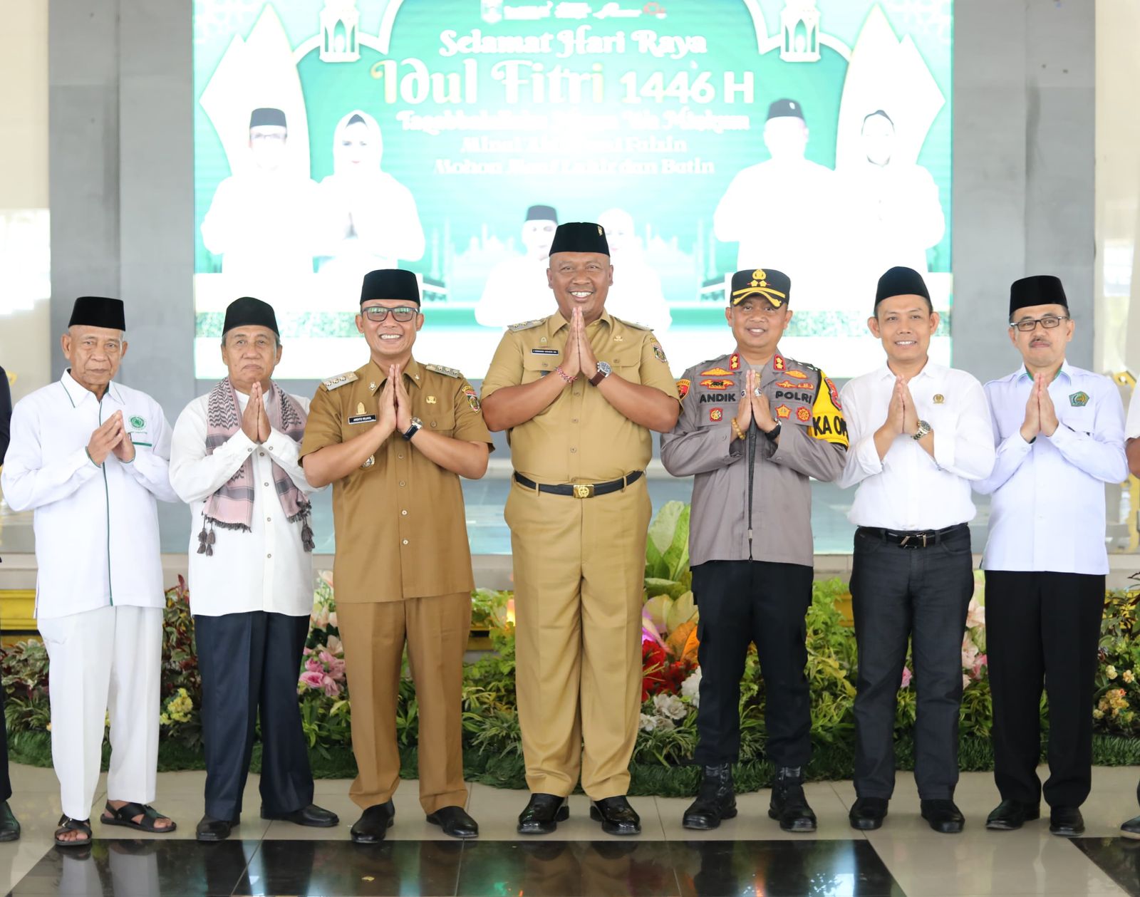 tribratanews.lampung.polri.go.id. Lampung Tengah, Selasa 08 April 2025 – Kapolres Lampung Tengah, Polda Lampung AKBP Andik Purnomo Sigit, S.H., S.I.K., M.M., menghadiri acara Halal Bihalal yang diselenggarakan oleh Pemerintah Kabupaten Lampung Tengah, bertempat di Gedung Sesat Agung Nuwo Balak, Gunung Sugih, pada Selasa (8/4/25) pukul 09.00 WIB.Kegiatan tersebut merupakan bagian dari tradisi pasca Hari Raya Idulfitri 1446 Hijriah yang bertujuan untuk mempererat tali silaturahmi antar unsur pemerintahan, Forkopimda, dan seluruh elemen masyarakat. Acara ini dihadiri oleh Bupati Lampung Tengah, dr. H. Ardito Wijaya, M.K.M, Wakil Bupati Lampung Tengah, I Komang Koheri, S.E, Jajaran Forkopimda Lampung Tengah, para pejabat utama (PJU) Polres Lampung Tengah, tokoh agama, tokoh masyarakat serta tamu undangan lainnya. Dalam sambutannya, Bupati Ardito Wijaya mengatakan, dalam suasana hari yang fitri ini, perkenankan kami, baik atas nama pribadi, keluarga dan jajaran Pemerintah Kabupaten Lampung Tengah, mengucapkan taqabalallahu minna waminkum shiyamana washiyamakum, selamat hari raya idul fitri 1446 hijriyah, minal aidhin walfaizin, mohon maaf lahir & batin. Selanjutnya, dalam kaitannya dengan hubungan sesama manusia (hablum minannas), kegiatan halal bihalal ini, diharapkan dapat menjadi sarana kita agar saling membersihkan diri dengan tulus dan ikhlas. Saling memberi dan meminta maaf kepada sesama atas segala khilaf dan dosa yang pernah kita perbuat, dan berusaha untuk tidak lagi mengulangi kesalahan atau kekhilafan yang pernah kita perbuat sebelumnya. Diakhir sambutannya, Bupati Lampung Tengah berharap semoga idul fitri tahun ini menjadi titik awal kita untuk berbenah diri, menyiapkan konsep, bekerja ikhlas, berkarya nyata, serta senantiasa berkontribusi dan berpartisipasi aktif. Sementara itu, Kapolres Lampung Tengah, Polda Lampung AKBP Andik Purnomo Sigit, S.H., S.I.K., M.M turut mengapresiasi pelaksanaan kegiatan tersebut. Menurutnya, Halal Bihalal menjadi wadah yang baik untuk memperkuat hubungan silaturahmi antara Kepolisan dan berbagai elemen pemerintahan serta masyarakat. “Polres Lampung Tengah akan terus mendukung program-program pemerintah daerah dan berkomitmen menjaga situasi Kamtibmas yang kondusif demi kenyamanan dan keamanan masyarakat,” ungkap Kapolres. Setelah sambutan, kegiatan dilanjutkan dengan sesi saling bermaafan, ramah tamah, dan foto bersama.