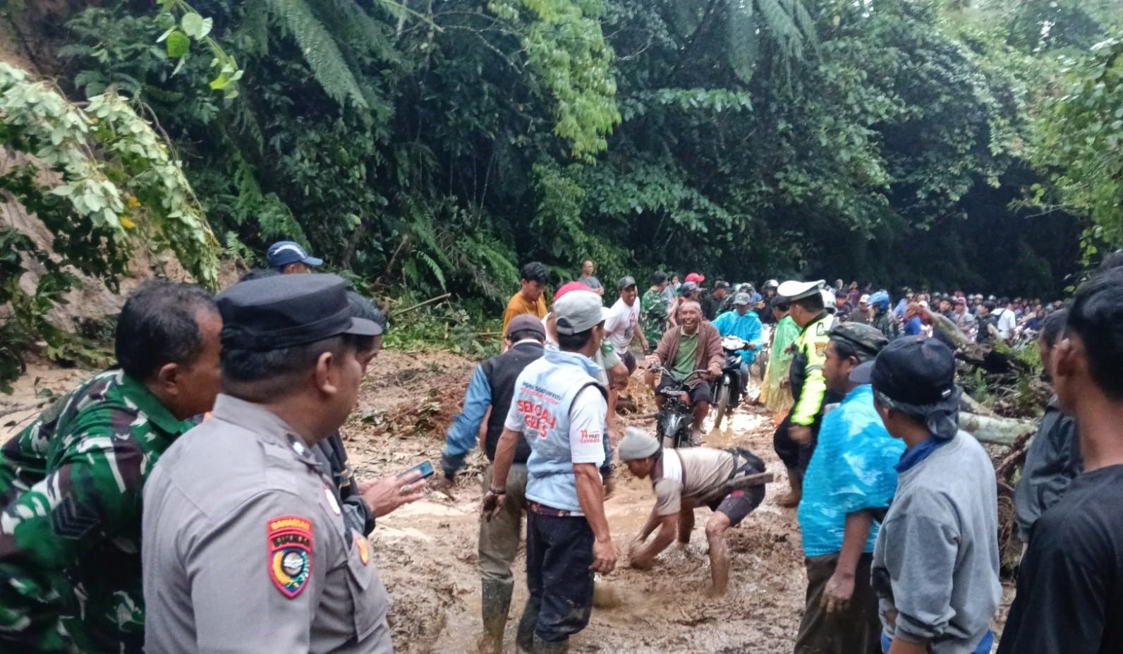 tribratanews.lampung.polri.go.id. Lampung Barat Kamis 02 Oktober 2025 – Personel Polres Lampung Barat membuka akses jalan dan pengaturan lalu lintas pasca terjadinya longsor di Jalan Lintas Liwa–Sumsel, tepatnya di Pekon Padang Cahya, pada Rabu sore (1/10/2025). Peristiwa longsor terjadi akibat hujan lebat yang mengguyur wilayah tersebut.Material longsor sempat menutup sebagian badan jalan, sehingga arus kendaraan terganggu. Personel kepolisian bersama unsur TNI, Tagana dan masyarakat dengan sigap melakukan penanganan di lokasi untuk membuka jalan dan mengurai kemacetan sekaligus menjaga keamanan pengguna jalan. Sekitar pukul 18.30 WIB, jalur lalu lintas berhasil kembali normal setelah material berhasil dibersihkan. Kapolres Lampung Barat, AKBP Rinaldo Aser, S.H., S.I.K., M.Si., melalui Kasat Lantas IPTU Deny Saputra, S.H., M.M., mengatakan bahwa kehadiran personel di lokasi bertujuan memastikan arus lalu lintas tetap terkendali dan pengguna jalan merasa aman. “Personel dari Polres Lampung Barat dan Polsek Balik Bukit langsung kami turunkan untuk membuka jalan, melakukan pengaturan lalu lintas sekaligus membantu proses pembersihan material. Kami mengimbau masyarakat agar tetap berhati-hati saat berkendara, terlebih dalam kondisi cuaca hujan yang berpotensi menimbulkan bencana alam,” ujarnya. Seorang warga setempat, afrizal (38), mengaku sempat khawatir karena jalan tersebut merupakan jalur utama warga menuju Liwa.