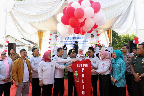 tribratanews.lampung.polri.go.id. LAMPUNG SELATAN -- Pj. Gubernur Lampung Samsudin melakukan Pencanangan Pekan Imunisasi Nasional (PIN) Polio Tingkat Provinsi Lampung Tahun 2024, yang berlangsung di Lapangan Desa Bumi Sari, Natar, Lampung Selatan, Selasa (23/7/2024).Pencanganan PIN Polio tersebut akan menyasar 1.259.539 anak, usia 0 s.d 7 tahun. Pencanganan ditandai dengan penetesan vaksin Polio secara simbolis oleh Pj. Gubernur Lampung Samsudin dan penerbangan balon. Dalam sambutannya, Pj. Gubernur Samsudin menyampaikan bahwa Indonesia telah berhasil menerima sertifikat bebas polio bersama dengan negara anggota WHO lainnya di Regional South East Asia Region (SEARO) pada bulan Maret 2014, sementara itu masih tersisa negara lain yang masih dikategorikan endemis penyakit polio contohnya Afganistan dan Pakistan. "Seluruh negara telah berkomitmen untuk bersama melakukan upaya seoptimal mungkin untuk membasmi penyakit polio dari seluruh dunia pada tahun 2026," ujarnya. Pada bulan November 2022, jelas Pj. Gubernur Samsudin, terkonfirması kasus Poliomyelitis pada anak usia 7 tahun yang diakibatkan oleh Vaccine-Derived Polio Virus Type (VDPV2) di Provinsi Aceh. Penemuan kasus ini di tanggulangi cepat oleh tim gabungan Kemenkes RI mitra. "Oleh karena itu, nanti saya berharap apabila terjadi kasus-kasus atau mengarah polio di Provinsi Lampung, saya minta dinas kesehatan Provinsi dan Dinas Kesehatan Kabupaten/Kota untuk bergerak cepat dalam menanggulangi apabila terjadi polio atau gejala polio atau peluang-peluang yang akan menyebabkan polio di Provinsi Lampung," ujarnya. Tim penanggulangan melakukan pengumpulan sampel tinja dari kontak erat, sampel tinja dari anak sehat sekitar lingkungan, mengkaji data kasus lumpuh layuh mendadak secara retrospektif serta Kemenkes juga mendukung persiapan pelaksanaan imunisasi dalam rangka penanggulangan Kejadian Luar Biasa (KLB) "Provinsi Lampung merupakan salah satu provinsi yang juga mempunyai risiko tinggi penularan virus Polio, oleh karena itu untuk mencegah agar tidak terjadi KLB Polio maka mulai tanggal 23 Juli 2024 akan dilakukan PIN Polio secara serentak di 15 kabupaten/kota," jelas Pj. Gubernur Samsudin. "Hari ini dilaksanakan serentak di 15 kabupaten/kota yaitu PIN Polio serentak, untuk itu kadis kesehatan memantau pelaksanaan polio serentak, mohon dilihat dan dilaporkan," tambahnya. Sasaran PIN Polio untuk Provinsi Lampung sebesar 1.259.539 anak, usia 0 s.d 7 tahun. Pos pelayanan PIN Polio dapat di lakukan di Posyandu, Pustu, Puskesmas, Sekolah dan pos pelayanan imunisasi lainnya yang berada di bawah wilayah kerja Puskesmas. "Pemerintah di semua jenjang telah menyiapkan segala sumber daya yang diperlukan. Selanjutnya peran organisasi kemasyarakatan, organisasi profesi, tokoh agama, tokoh masyarakat serta peran aktif penggerakan masyarakat agar semua anak bayi, baduta, anak balita dan anak sekola RA, SD/MI dan anak berkebutuhan khusus/SLB untuk imunisasi tetes Polio," jelasnya. "Pencanangan ini merupakan bukti komitmen kita bahwa Provinsi Lampung siap menyukseskan program Imunisasi di Indonesia untuk menyelenggarakan Pekan Imunisasi Nasional (PIN) Polio yang akan dilaksanakan mulai hari ini tanggal 23 Juli 2024," tambahnya. Dalam kesempatan itu, Kadis Kesehatan Provinsi Lampung Edwin Rusli menjelaskan Pemerintah mempunyai komitmen kuat untuk mewujudkan Eradikasi Polio di Indonesia pada tahun 2026