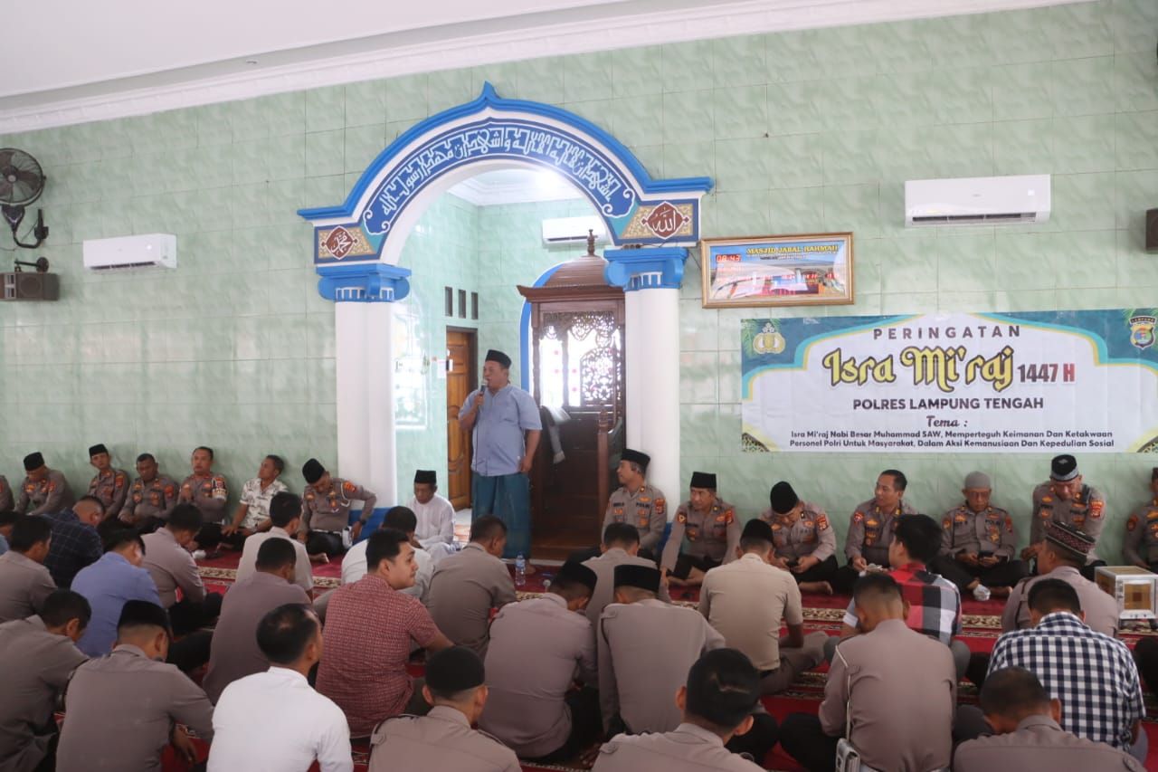 tribratanews.lampung.polri.go.id. Lampung Tengah, Jumat 16 Januari 2026 — Polres Lampung Tengah menggelar Peringatan Isra Mi’raj Nabi Muhammad SAW 1447 Hijriah dengan tema “Hikmah Isra Mi’raj Nabi Muhammad SAW Memperteguh Keimanan dan Ketaqwaan Personel Polri untuk Masyarakat dalam Aksi Kemanusiaan dan Kepedulian Sosial”, Kamis (15/1/26) pagi, bertempat di Masjid Jabal Rahmah Polres Lampung Tengah.