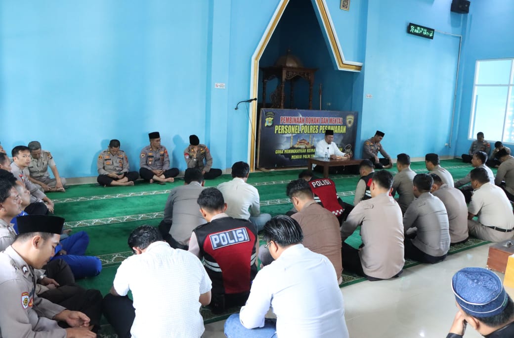 Tribratanews.lampung.polri.go.id Pesawaran, Jumat 07 Nopember 2025 Polres Pesawaran, Polda Lampung – Dalam upaya meningkatkan keimanan, ketakwaan, serta membentuk karakter personel Polri yang berakhlak dan berintegritas, Polres Pesawaran menggelar kegiatan Bimbingan Rohani dan Mental (Binrohtal) di Masjid Annabawi Mapolres Pesawaran, Jumat (7/11/2025).Kegiatan Binrohtal tersebut diikuti oleh Pejabat Utama (PJU) dan seluruh personel Polres Pesawaran. Kegiatan ini dipimpin langsung oleh Wakapolres Pesawaran Kompol Sugandhi Satria Nugraha, S.I.P., M.H., dengan siraman rohani yang disampaikan oleh Ustaz Dailami.
