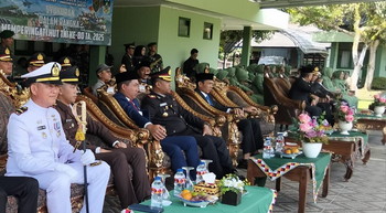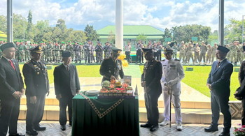 tribratanews.lampung.polri.go.id. Tanggamus, Minggu 05 Oktober 2025– Momen penuh keakraban dan haru mewarnai peringatan Hari Ulang Tahun TNI ke-80 di Makodim 0424 Tanggamus, Minggu pagi (5/10/2025). Kapolres Tanggamus AKBP Rahmad Sujatmiko, S.I.K., M.H., bersama jajaran Forkopimda datang membawa kue ulang tahun besar bertuliskan “Dirgahayu TNI ke-80” lengkap dengan lilin dan ucapan selamat — menghadirkan kejutan manis yang tak terlupakan bagi jajaran Kodim 0424.Saat rombongan pembawa kue ulang tahun dari Polres memasuki halaman Kodim, seluruh anggota TNI yang baru saja menuntaskan upacara tertegun sejenak. Musik mars perjuangan bergema, dan tepuk tangan riuh menyambut kedatangan rombongan. Suasana resmi berubah hangat, penuh tawa dan keakraban.