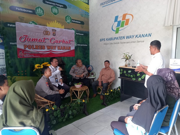 Kapolres Way Kanan AKBP Teddy Rachesna menyampaikan melalui Kasat Binmas AKP Burhanuddin kedatanganya di BPS Kabupaten Way Kanan selain dalam rangka silaturahmi juga melakukan kegiatan Jum’at Curhat guna meningkatkan optimalisasi pelayanan publik Kepolisian.
