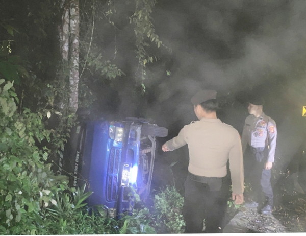 tribratanews.lampung.polri.go.id. Pesisir barat-polsek bengkunat tinjau lokasi terkait adanya laporan dari masyarakat terjadi laka lantas di kawan hutan TNBBS tepatnya di Patok KM 50.Senin(6/1/2024) pada pukul 22.30 Wib.Kapolres Pesisir Barat AKBP Alsyahendra S.I.K., M.H., melalui Kasihumas Polres Pesisir Barat IPTU Kasiyono S.E., M.H., menyampaikan”kami mendapatkan informasi bahwasanya telah terjadi laka tunggal yang berada di hutan kawan TNBBS.yang melibatkan 1 truk hino fusi dengan bermuatan minibus ELF R4.”ucap kasi humas “Dari keterangan para saksi pada hari senin tanggal 6 Januari tepatnya pada pukul 22.30 wib.dengan bermuatan minibus ELF R4 fuso tersebut berangkat dari krui untuk menuju ke tegal jawa tengah pada malam itu” “Kemudian sesampainya di turunan patok KM 50 TNBBS truk hilang kendali dan mengalami rem blong.sehingga truk tersebut mundur dan terperosok ke dalam jurang.” “Dari kejadian ini tidak terdapat korban jiwa dalam kecelakaan tersebut .supir beserta penumpang yang berada di minibus berjumlah 12 orang seluruhnya selamat dan mengalami luka ringan”ucap kasi humas “Dari kejadian tersebut tidak ada kemacetan atau penumpukan kendaraan di jalan lintas TNBBS.hingga saat ini jalan masih bisa dilalui dengan aman dan kami ingatkan kepada seluruh pengendara agar tetap waspada dan berhati-hati”tutup kasi humas