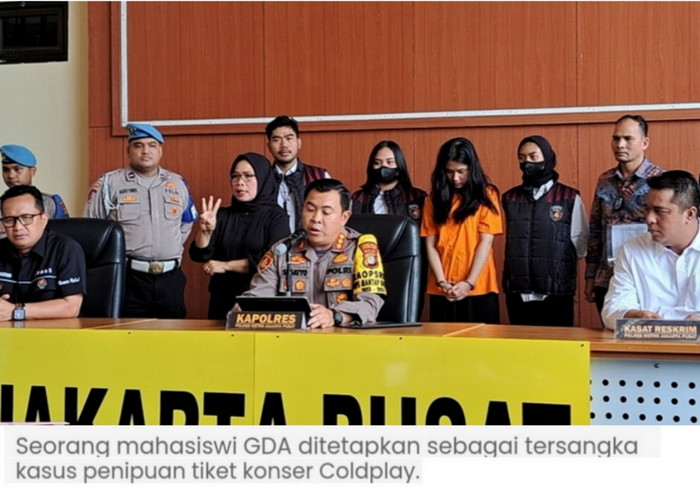 https://tribratanews.lampung.polri.go.id.      PMJ NEWS - Mahasiswi bernama Ghisca Debora Aritonang (19) ditetapkan sebagai tersangka dalam kasus penipuan dan atau penggelapan tiket konser Coldplay dengan total kerugian mencapai Rp5,1 miliar.