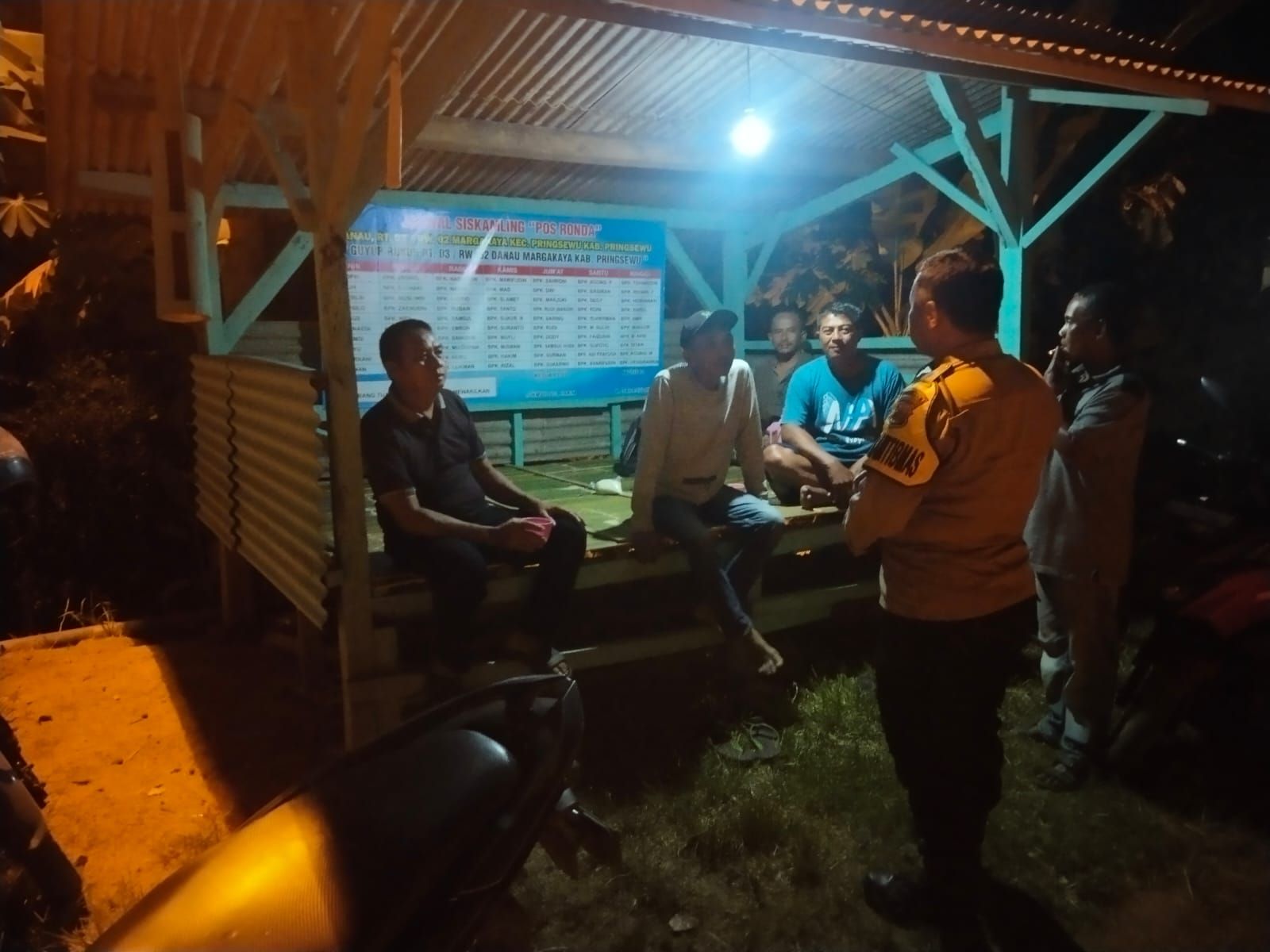 tribratanews.lampung.polri.go.id Pringsewu Selasa 30 September 2025 – Personel Bhabinkamtibmas Polsek Pringsewu Kota, Aipda Joni Ika, melaksanakan patroli rutin di desa binaannya, Pekon Margakaya, Kecamatan Pringsewu, Senin malam (29/9) hingga Selasa dinihari (30/09).Dalam patroli tersebut, Aipda Joni menyambangi dan mengecek warga yang sedang piket ronda, salah satunya di Poskamling Guyub Rukun RT 03 RW 02. Selain memberikan semangat kepada warga yang berjaga, ia juga mengingatkan pentingnya menjaga kekompakan dan kewaspadaan dalam ronda malam. “Sebagai Bhabinkamtibmas, saya bersama warga terus menggiatkan siskamling. Poskamling ini bukan hanya tempat ronda, tapi wadah kebersamaan dan kepedulian warga dalam menjaga keamanan lingkungannya,” ujar Aipda Joni. terpisah Kapolsek Pringsewu Kota, AKP Ramon Zamora, mengapresiasi peran aktif polisi dan warga dalam menjaga keamanan di lingkungannya.