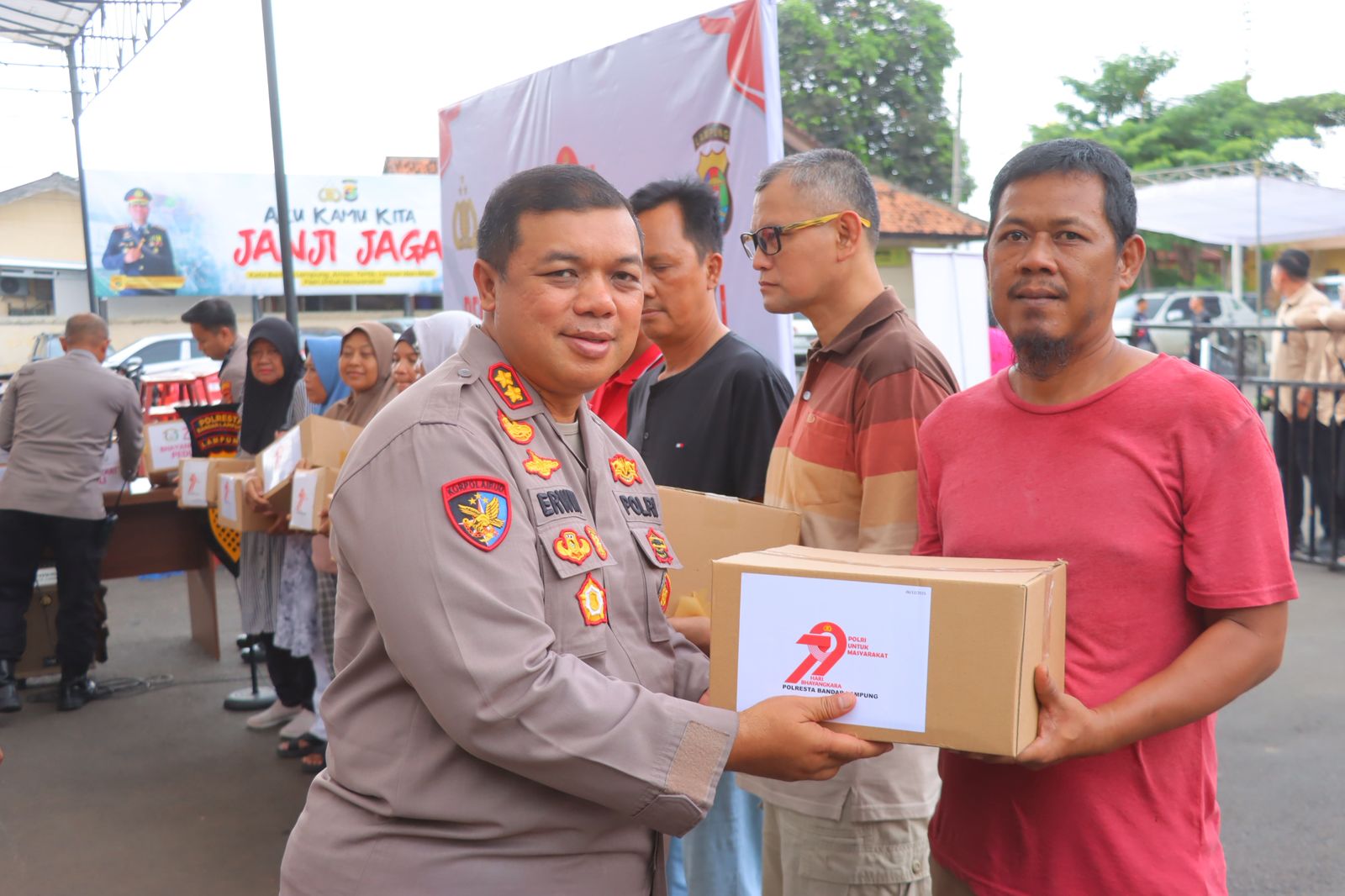 tribratanews.lampung.polri.go.id. Bandar Lampung - Polresta Bandar Lampung menyalurkan puluhan paket bantuan sosial kepada masyarakat kurang mampu yang tinggal di sekitar wilayah Mapolresta Bandar Lampung, Sabtu (28/6/2025).Kegiatan ini merupakan wujud kepedulian Polri kepada masyarakat serta menjadi bagian dari rangkaian bakti sosial Hari Bhayangkara ke-79 yang mengusung tema “Polri Untuk Masyarakat”. Waka Polresta Bandar Lampung, AKBP Erwin Irawan mengatakan, bakti sosial ini merupakan bentuk nyata hadirnya Polri di tengah masyarakat, terutama bagi warga yang membutuhkan. Paket bantuan berupa beras 5 kg, gula, minyak goreng, dan bahan kebutuhan pokok lainnya. “Kita salurkan bantuan sosial ini kepada sekitar 50 kepala keluarga, dan yang kita prioritaskan yang tinggal di sekitar Mapolres, tepatnya kelurahan Gotong Royong,” Kata AKBP Erwin.