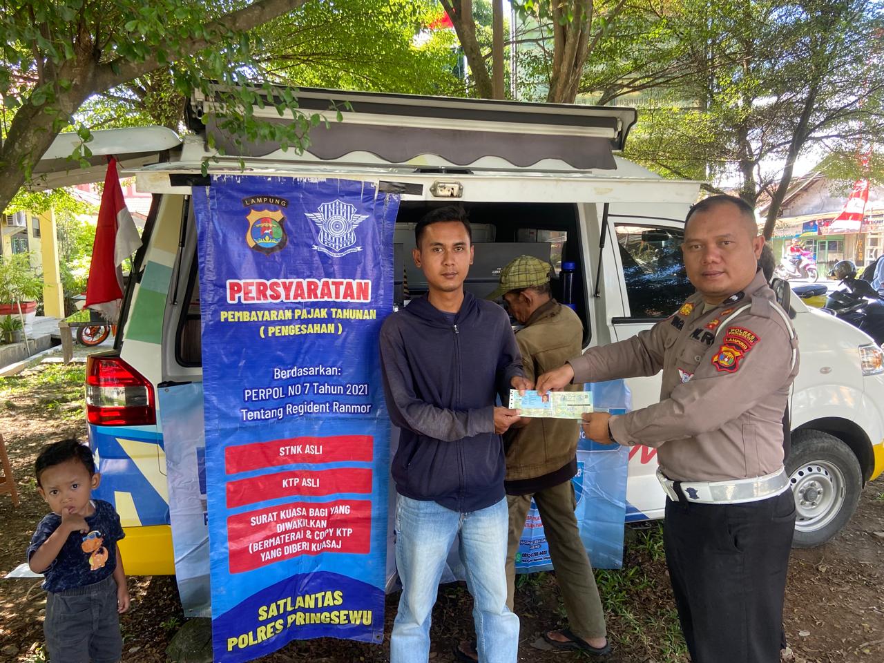 tribratanews.lampung.polri.go.id. Pringsewu Senin 05 Januari 2026 – Polres Pringsewu terus mendorong kepatuhan masyarakat dalam membayar pajak kendaraan bermotor dengan mengerahkan layanan Samsat Keliling setiap hari. Layanan ini memudahkan warga yang tak sempat mendatangi kantor Samsat karena kesibukan kerja maupun jarak yang jauh.Namun demikian, Samsat Keliling hanya melayani pembayaran pajak tahunan kendaraan bermotor, baik sepeda motor maupun mobil. Untuk layanan lain seperti pajak lima tahunan, ganti pelat, mutasi, maupun BBN (Bea Balik Nama), masyarakat tetap harus mengurusnya di Samsat induk. Salah satu warga, Rizki (34), mengaku sangat terbantu dengan layanan keliling tersebut.