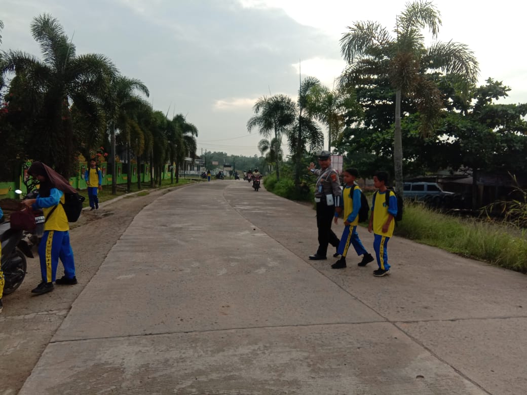 Satlantas Polres Mesuji Gelar Giat Pam dan Penyeberangan Anak Sekolah di Depan SMPN 1 Simpang Pematang