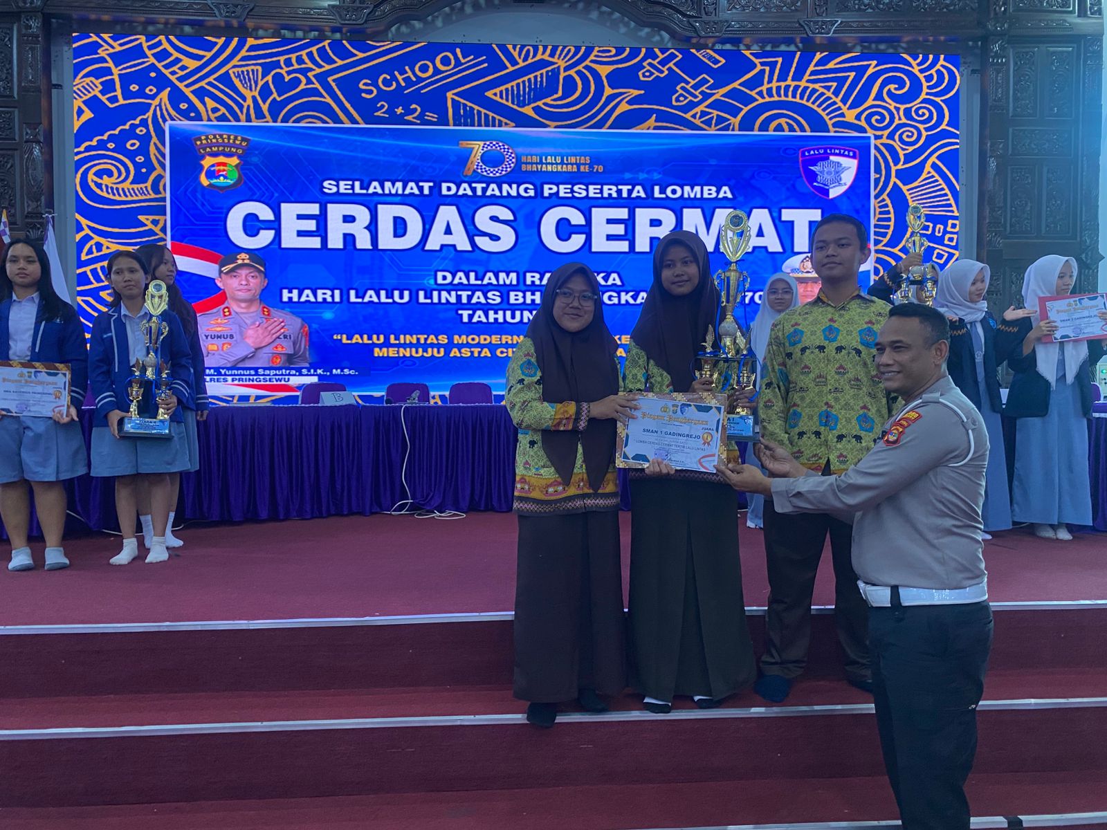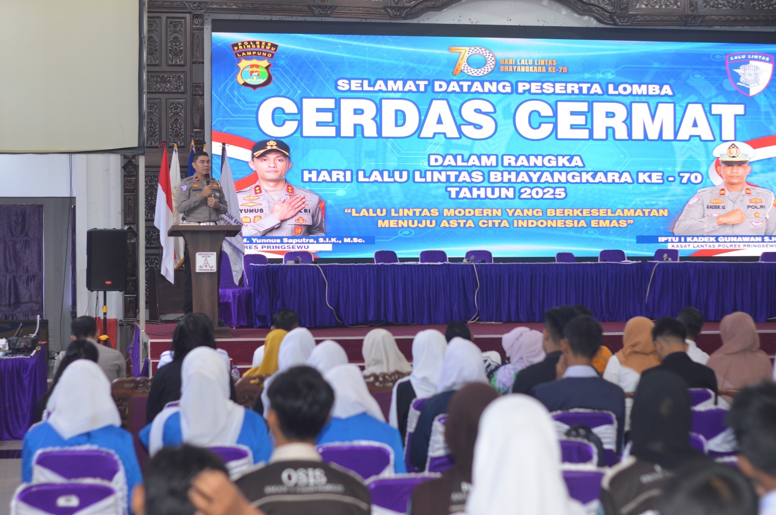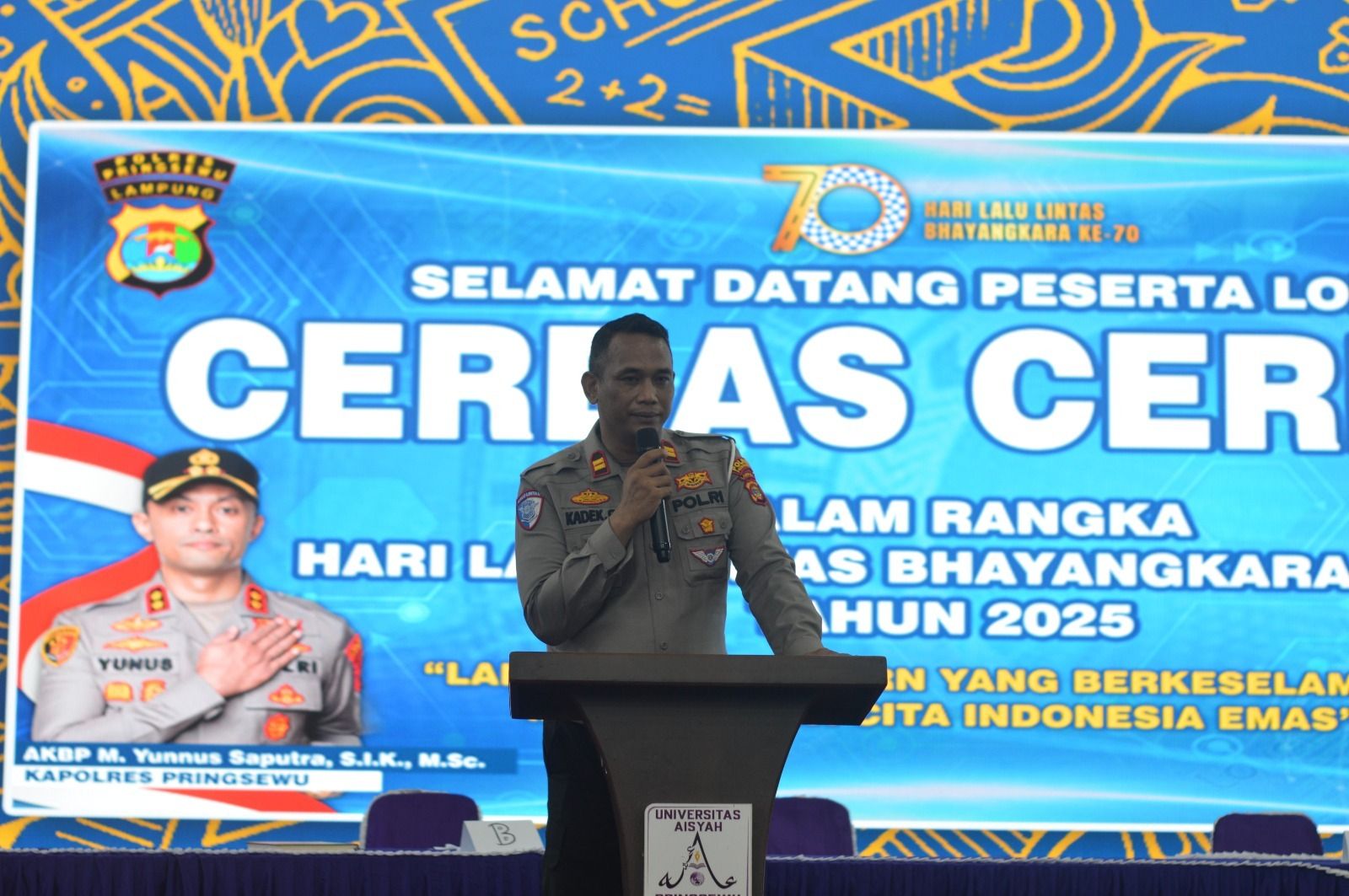 tribratanews.lampung.polri.go.id. Pringsewu Jumat 26 September 2025 – Dalam rangka memperingati Hari Lalu Lintas Bhayangkara ke-70 tahun 2025, Satuan Lalu Lintas (Satlantas) Polres Pringsewu menggelar Lomba Cerdas Cermat Lalu Lintas tingkat SMA/sederajat se-Kabupaten Pringsewu. Mengusung tema “Tertib Lalu Lintas”, kegiatan berlangsung di Aula Universitas Aisyah Pringsewu (UAP), Rabu (24/9), dan dibuka oleh Kasat Lantas IPTU I Kadek Gunawan mewakili Kapolres Pringsewu, AKBP M. Yunnus Saputra.Dalam sambutannya, IPTU I Kadek Gunawan menegaskan pentingnya kegiatan tersebut sebagai upaya menanamkan pemahaman aturan dan risiko berkendara sejak dini. “Lomba ini bukan hanya ajang kompetisi, tetapi juga wadah untuk membentuk kesadaran generasi muda agar tertib berlalu lintas,” ujarnya.