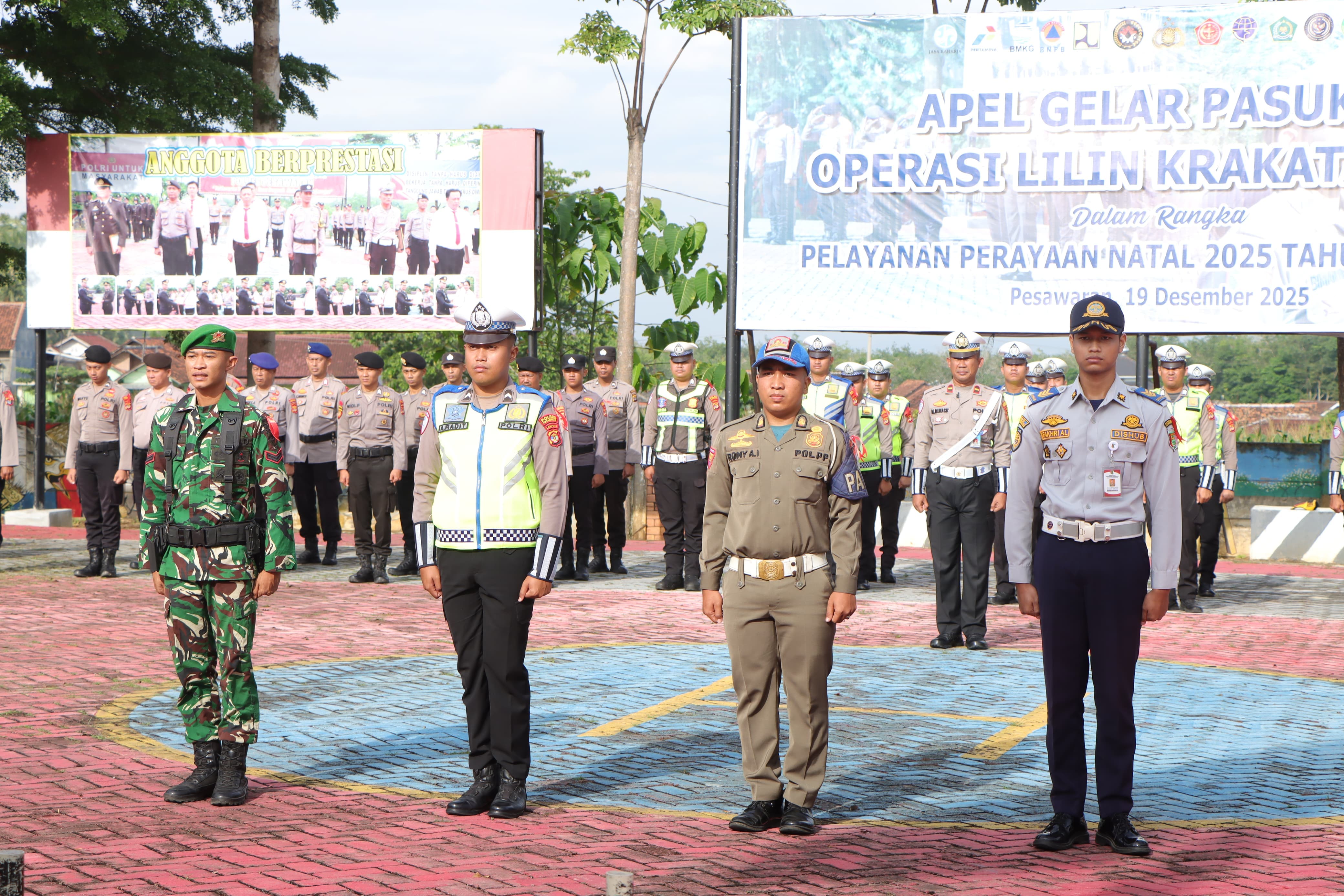 tribratanews.lampung.polri.go.id. Pesawaran Sabtu 20 Desember 2025 Polres Pesawaran, Polda Lampung– Kepolisian Resor Pesawaran bersama jajaran Pemerintah Kabupaten Pesawaran melaksanakan Apel Gelar Pasukan Operasi Lilin Krakatau 2025 sebagai langkah pemantapan kesiapan pengamanan hari besar keagamaan dan pergantian tahun. Kegiatan yang berlangsung di Lapangan Apel Mapolres Pesawaran ini dipimpin secara bersama oleh Kapolres Pesawaran, AKBP Heri Sulistyo Nugroho, S.I.K., M.I.K., dan Asisten Administrasi Umum Sekdakab Pesawaran, Ir. Heriansyah, M.M., sebagai representasi kuatnya kolaborasi lintas sektoral di wilayah tersebut.