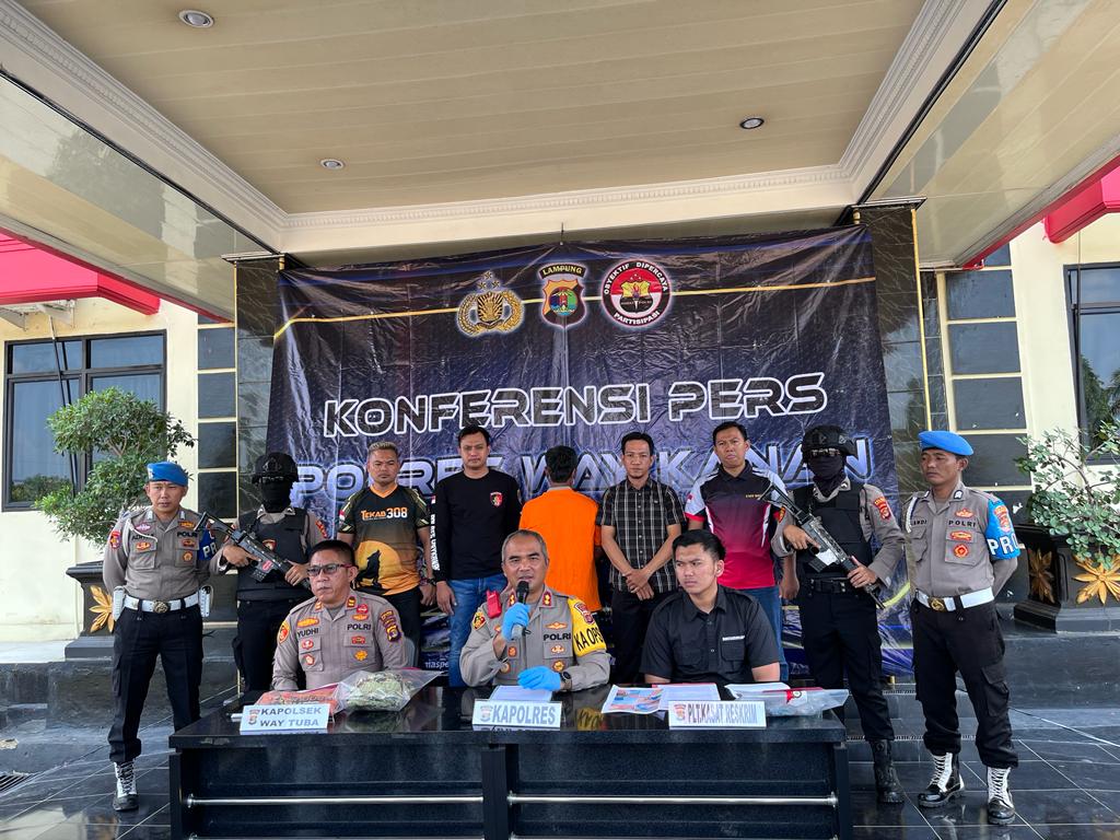 Kapolres Way Kanan AKBP Pratomo Widodo didampingi Plt.Kasatreskrim Ipda Riski Aulia serta Kapolsek Way Tuba Iptu Yudhianto. Pada hari Sabtu 28 Oktober 2023 di Mako Polres Way Kanan.
