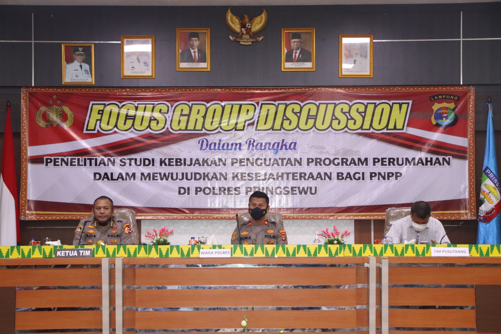Tak hanya itu, penelitian ini sekaligus sebagai bahan masukan Tim kepada pimpinan Polri dalam rangka penetapan kebijakan strategis penyediaan perumahan tinggal dalam mewujudkan kesejahteraan bagi PNPP. Sedangkan, untuk metode pengumpulan data yang digunakan dalam penelitian ini adalah Focus Group Discussion (FGD) yang saat itu berlangsung di aula utama Bupati Pringsewu
