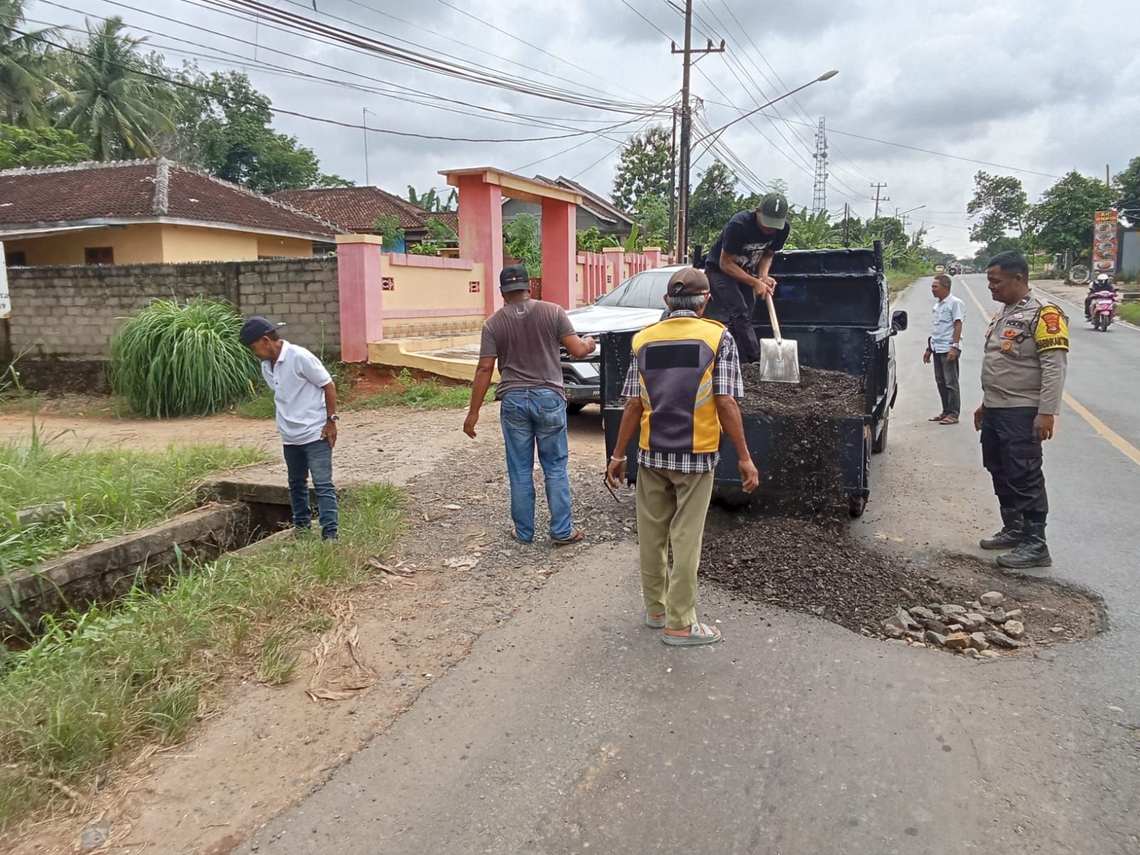 Bhabinkamtibmas Polsek Abung Selatan Bersama Warga Timbun Jalan Berlubang di Jalinsum
