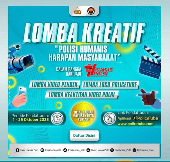 tribratanews.lampung.polri.go.id. LAMPUNG – Dalam rangka memperingati Hari Ulang Tahun Humas Polri ke-74 Tahun 2025, Divisi Humas Polri menyelenggarakan kegiatan lomba kreatif sebagai wadah partisipasi masyarakat, pelajar, mahasiswa, maupun wartawan untuk mewujudkan sinergitas Polri Untuk Masyarakat. Senin(6/10/25).HUT kali ini mengusung tema "POLISI HUMANIS HARAPAN MASYARAKAT" yang bertujuan menumbuhkan kreativitas, meningkatkan partisipasi publik, serta memperkuat citra Polri sebagai institusi yang humanis, transparan, dan dekat dengan masyarakat. “Lomba kreatif ini merupakan sarana yang efektif untuk menjalin sinergi antara Polri dan masyarakat. Melalui karya-karya yang dihasilkan, kami berharap dapat menggambarkan peran Polri dalam memberikan pelayanan yang humanis sesuai harapan masyarakat,” Ucap Kabid Humas Kabid Humas Polda Lampung, Kombes Pol. Yuni Iswandari Yuyun, menyampaikan bahwa lomba ini merupakan kesempatan bagi masyarakat untuk berpartisipasi aktif dalam menyemarakkan HUT Humas Polri. “Melalui lomba ini, kami berharap dapat melahirkan karya-karya edukatif dan inspiratif yang menggambarkan peran Polri dalam memberikan pelayanan kepada masyarakat secara humanis. Kami mengajak seluruh elemen masyarakat, termasuk pelajar, mahasiswa, dan wartawan, untuk berpartisipasi memeriahkan HUT Humas Polri ke-74 ini,” ujarnya. Ada 3 jenis perlombaan yang bisa diikuti :