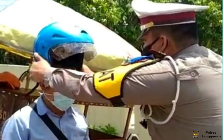 membagikan helm dan masker itu juga, Sat Lantas Polres Tanggamus juga