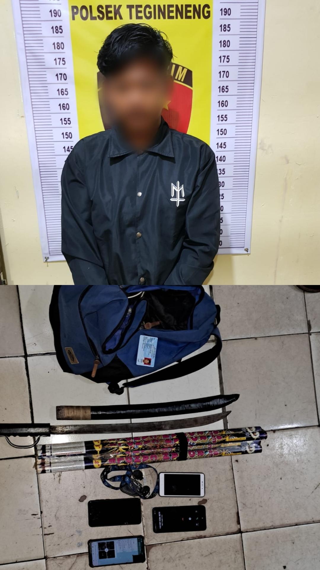 Dari barang bukti yang diamankan adalah dua (2) unit sepeda motor, satu (1) bilah pedang yang panjangnya sekitar satu (1) Meter, kemudian bsebanyak empat (4) unit Handphone 1 (satu) jaket terbuat dari kain parasut warna hitam merk dibelakang bertuliskan maternal, kemudian empat (4) mercon kembang api, satu (1) tas warna biru.