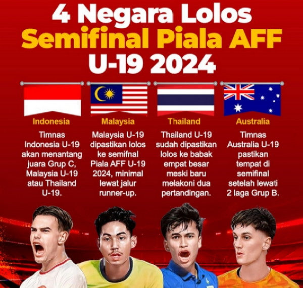 tribratanews.lampung.polri.go.id. Jakarta. Ini daftar lengkap tim yang sudah lolos ke babak semifinal Piala AFF U-19 2024, Rabu (24/7/24).Piala AFF U-19 2024 diikuti 12 negara, yang dibagi menjadi tiga grup. Setiap grup dihuni empat tim yang akan saling berhadapan. Jadi, masing-masing tim akan memainkan satu laga.