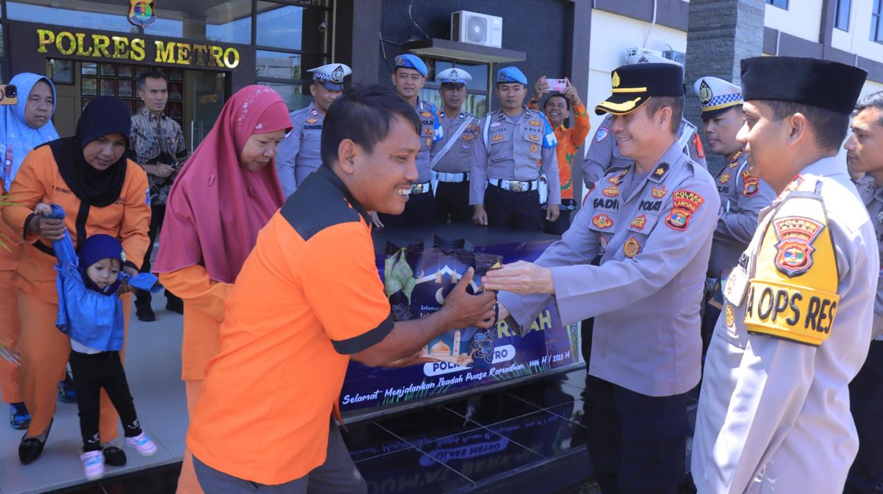 tribratanews.lampung.polri.go.id. Metro Lampung, Jumat 21 Maret 2025 – Dalam rangka menyambut bulan suci Ramadhan, Kapolres Metro menggelar kegiatan bakti sosial dengan membagikan paket sembako kepada pekerja tukang sapu jalan Kota Metro. Kegiatan ini berlangsung di depan Mapolres Metro dan dihadiri oleh Para Pejabat Utama Polres Metro.Kapolres Metro AKBP Heri Sulistyo Nugroho, S.IK., M.IK menyampaikan bahwa kegiatan ini merupakan wujud kepedulian Polres Metro terhadap tukang sapu jalan kota metro, khususnya di bulan penuh berkah ini.