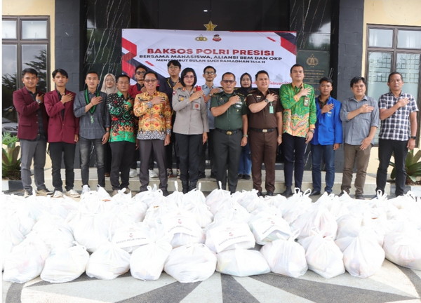 tribratanews.lampung.polri.go.id. Polres Pesawaran, Polda Lampung_Dalam semangat kepedulian dan kebersamaan menyambut bulan suci Ramadhan 1446 H, Polres Pesawaran menggelar kegiatan Bhakti Sosial Polri Presisi bekerja sama dengan Forkopimda, mahasiswa, Aliansi BEM, dan Organisasi Kepemudaan (OKP) di Kabupaten Pesawaran. Kegiatan ini berlangsung pada Kamis (27/02/2025) Pagi dengan menyasar masyarakat terdampak banjir, lansia, serta warga kurang mampu di empat desa di Kecamatan Gedong Tataan.Acara yang dimulai pukul 10.00 WIB ini dihadiri oleh berbagai unsur pimpinan daerah dan organisasi pemuda, termasuk Kapolres Pesawaran AKBP Maya Henny Hitijahubessy, S.H., S.I.K., M.M., Pabung Kodim 0421/LS Mayor Cpl Sarwan Iranu, Kadis Sosial Kabupaten Pesawaran Drs. M. Zuri Hadi, M.H., serta sejumlah pejabat kejaksaan, pengadilan, dan perwakilan mahasiswa dari berbagai organisasi. Kegiatan diawali dengan Zoom Meeting bersama Kapolri Jenderal Listyo Sigit Prabowo yang menegaskan pentingnya sinergi antara Polri dan masyarakat dalam menghadapi tantangan sosial, terutama menjelang bulan Ramadhan. Setelah sesi daring ini selesai pada pukul 10.50 WIB, acara dilanjutkan dengan penyerahan Secara simbolis paket sembako dari Kapolres Pesawaran kepada perwakilan mahasiswa dan organisasi kepemudaan.