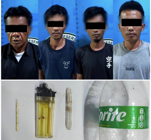 Setelah dilakukan penyelidikan dan melakukan penggerebekan di salah satu rumah yang berada di Kampung setempat, lanjutnya, pihaknya menemukan 4 orang pria yang sedang duduk di dalam rumah tersebut berikut semua barang bukti ada di sekitar para pelaku pada saat dilakukan penggeledahan