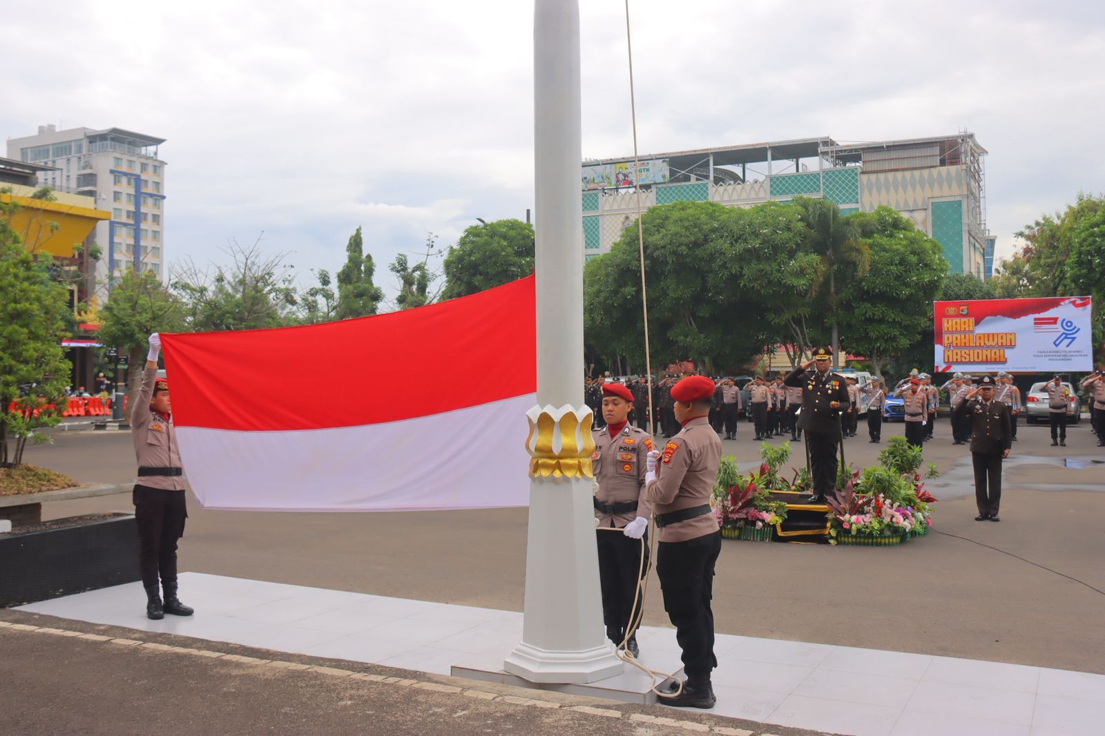 Tribratanews.lampung.polri.go.id Bandar Lampung , Senin 10 Nopember 2025 – Polresta Bandar Lampung menggelar upacara bendera dalam rangka memperingati Hari Pahlawan Nasional tahun 2025 di halaman Mapolres setempat, Senin (10/11/2025) pagi.Upacara berlangsung khidmat, diikuti oleh seluruh pejabat utama, para Kapolsek serta personel dan ASN. Bertindak sebagai inspektur upacara, Kapolresta Bandar Lampung, Kombes Pol Alfret Jacob Tilukay. Membacakan amanat Menteri Sosial RI, Kombes Pol Alfret memberikan pesan mendalam tentang makna perjuangan para pahlawan bangsa yang telah mengorbankan jiwa dan raga demi kemerdekaan Indonesia. “Para pahlawan mengajarkan kepada kita bahwa kemerdekaan tidak jatuh dari langit. Kemerdekaan lahir dari kesabaran, keberanian, kebersamaan, keikhlasan, dan kejujuran,” Kata Kapolresta. Kapolresta menjelaskan bahwa tiga nilai utama yang dapat diteladani dari para pahlawan bangsa.